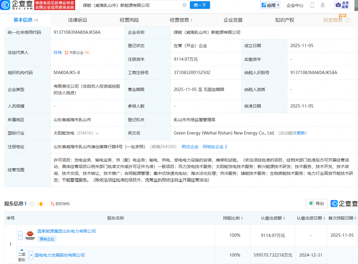 企查查APP显示,近日,绿能(威海乳山市)新能源有限公司成立,法定代表人为孙伟,注册资本为9114.97万元,经营范围包含:发电业务、输电业务、供(配)电业务;风力发电技术服务;集中式快速充电站;海水淡化处理等。企查查股权穿透显示,该公司由国电电力(600795)间接全资持股。