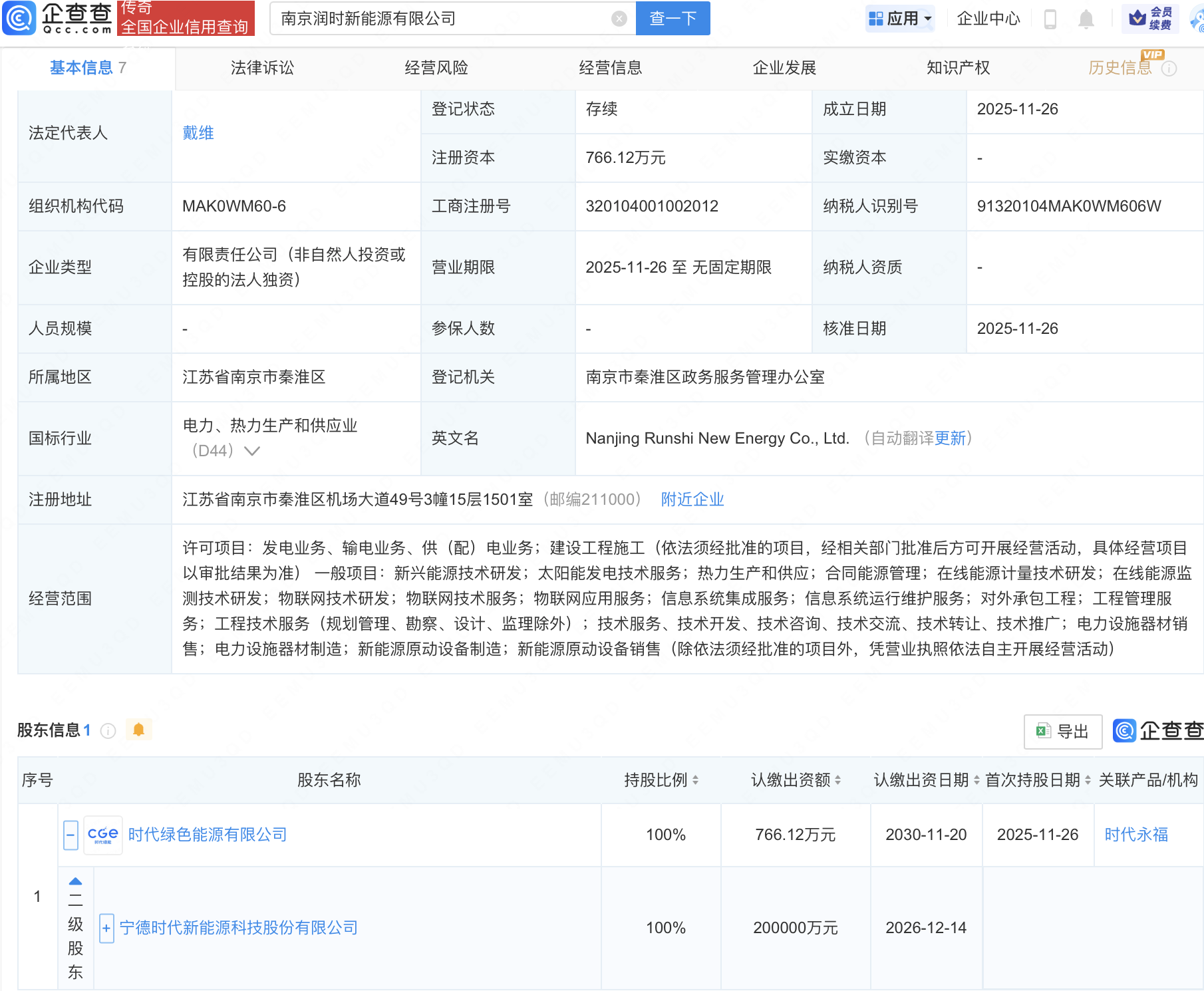 企查查APP显示,近日,南京润时新能源有限公司成立,经营范围包含:在线能源监测技术研发;物联网技术研发;物联网技术服务;物联网应用服务;信息系统集成服务等。企查查股权穿透显示,该公司由宁德时代(300750)间接全资持股。