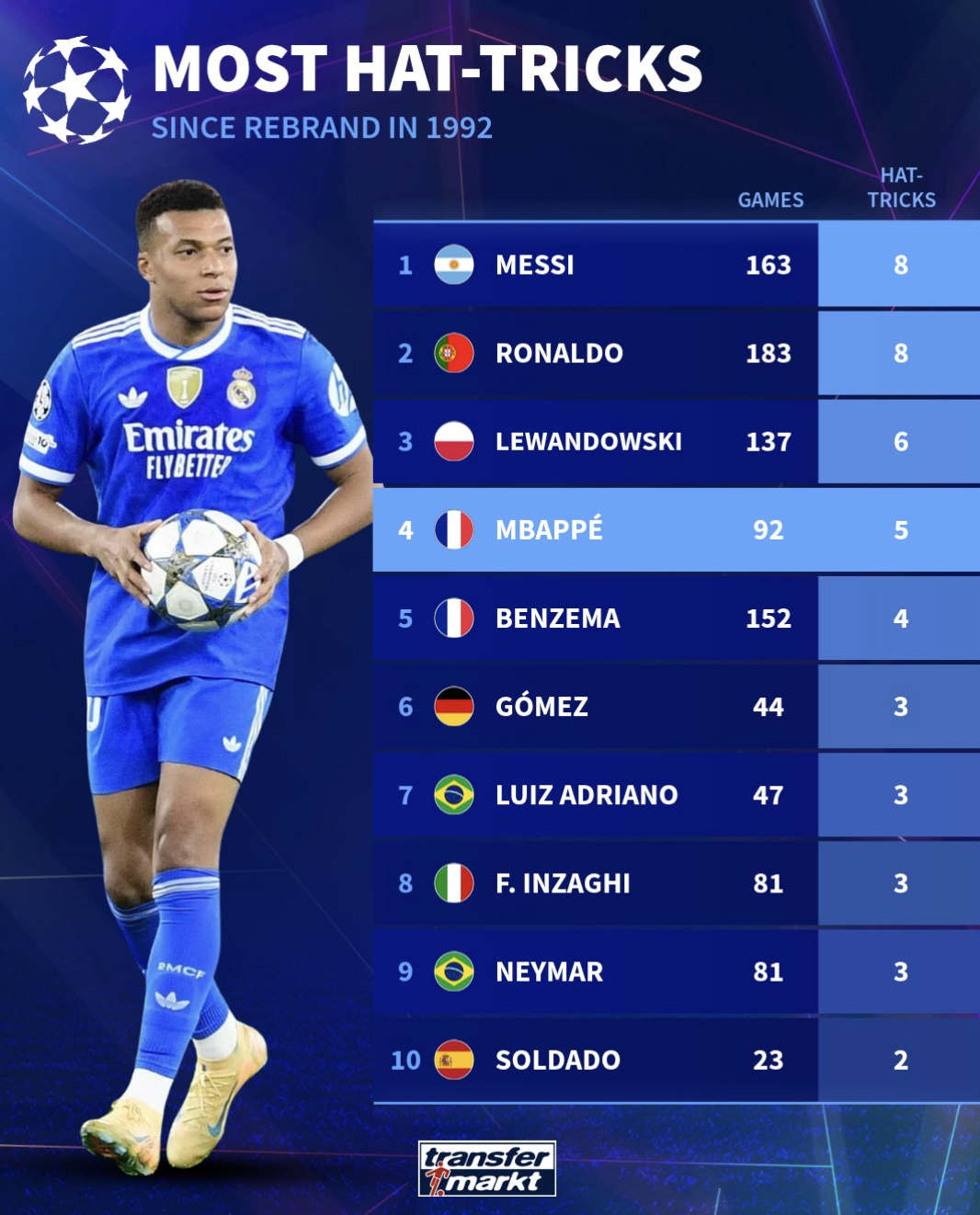本轮打进4球的姆巴佩使自己的戴帽次数上升到5次,排在第四位。仅次于梅罗的各8次以及莱万的6次。