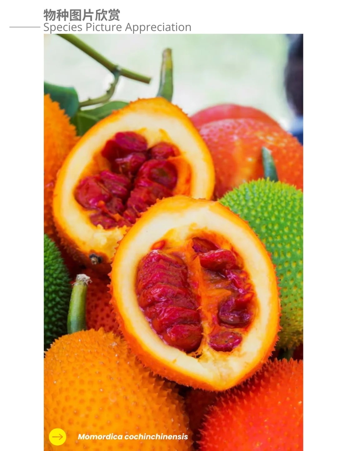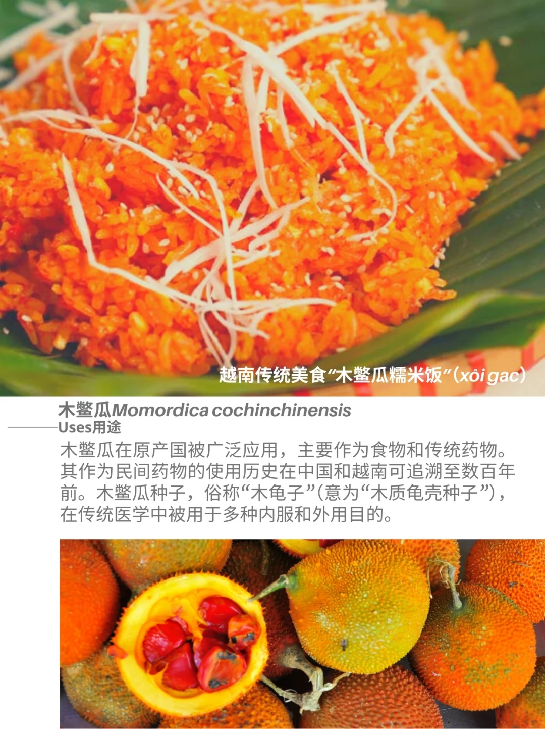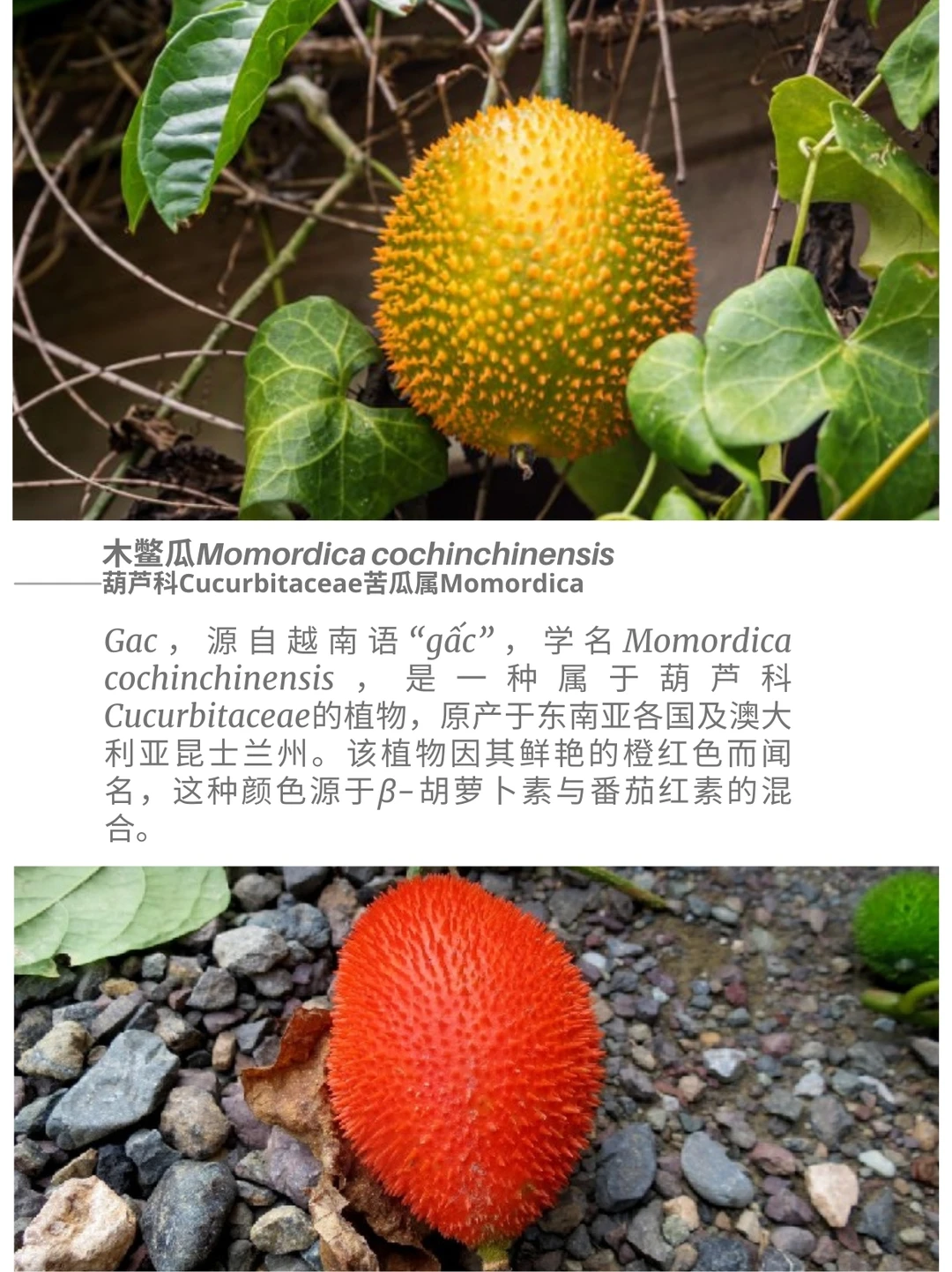 葫芦科 木鳖瓜 Momordica cochinchinensis 苦瓜属 藤本植物 胡萝卜素 番茄红素 蔬菜 饱和脂肪酸 多不饱和脂肪酸 木鳖瓜Momordica cochinchinensis,是一种属于葫芦科Cucurbitaceae苦瓜属Momordica的植物,原产于东南亚各国及澳大利亚昆士兰州。该植物因其鲜艳的橙红色而闻名,这种颜色源于β-胡萝卜素与番茄红素的混合。