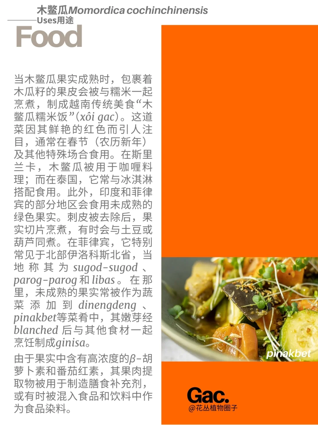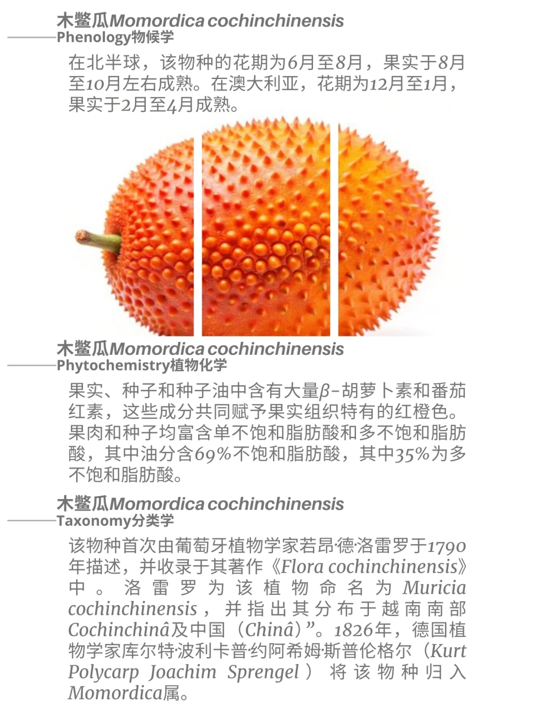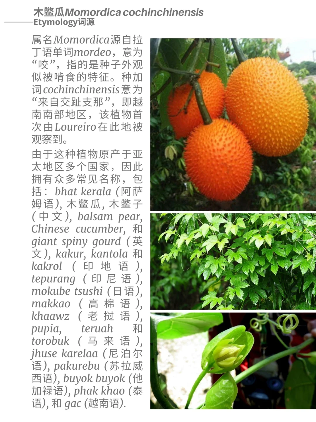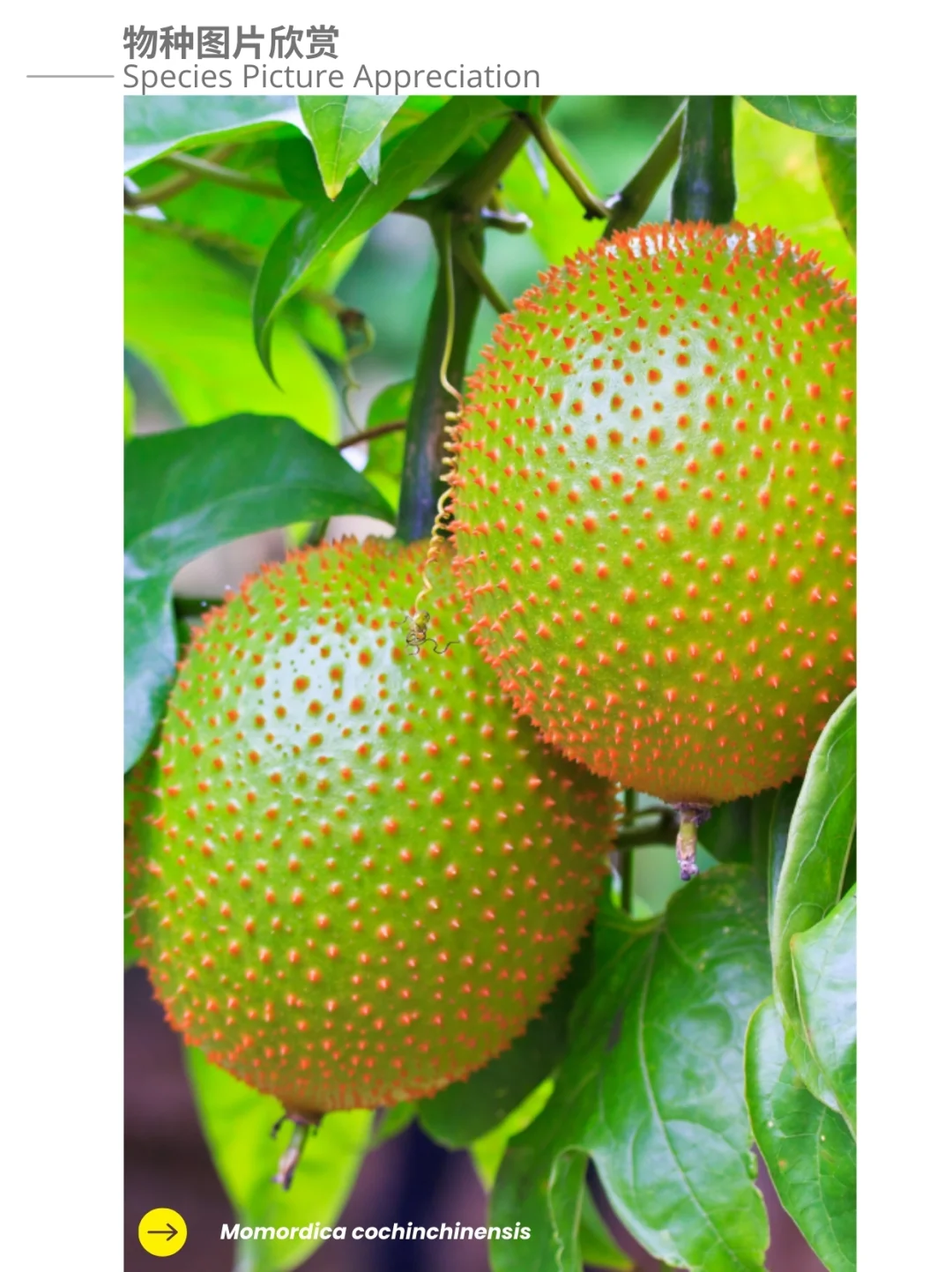 葫芦科 木鳖瓜 Momordica cochinchinensis 苦瓜属 藤本植物 胡萝卜素 番茄红素 蔬菜 饱和脂肪酸 多不饱和脂肪酸 木鳖瓜Momordica cochinchinensis,是一种属于葫芦科Cucurbitaceae苦瓜属Momordica的植物,原产于东南亚各国及澳大利亚昆士兰州。该植物因其鲜艳的橙红色而闻名,这种颜色源于β-胡萝卜素与番茄红素的混合。