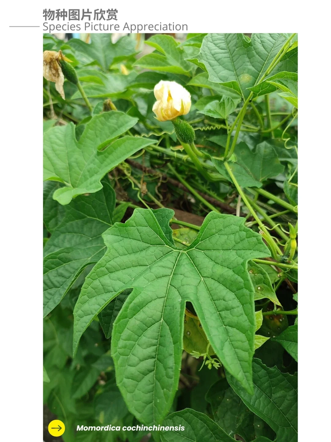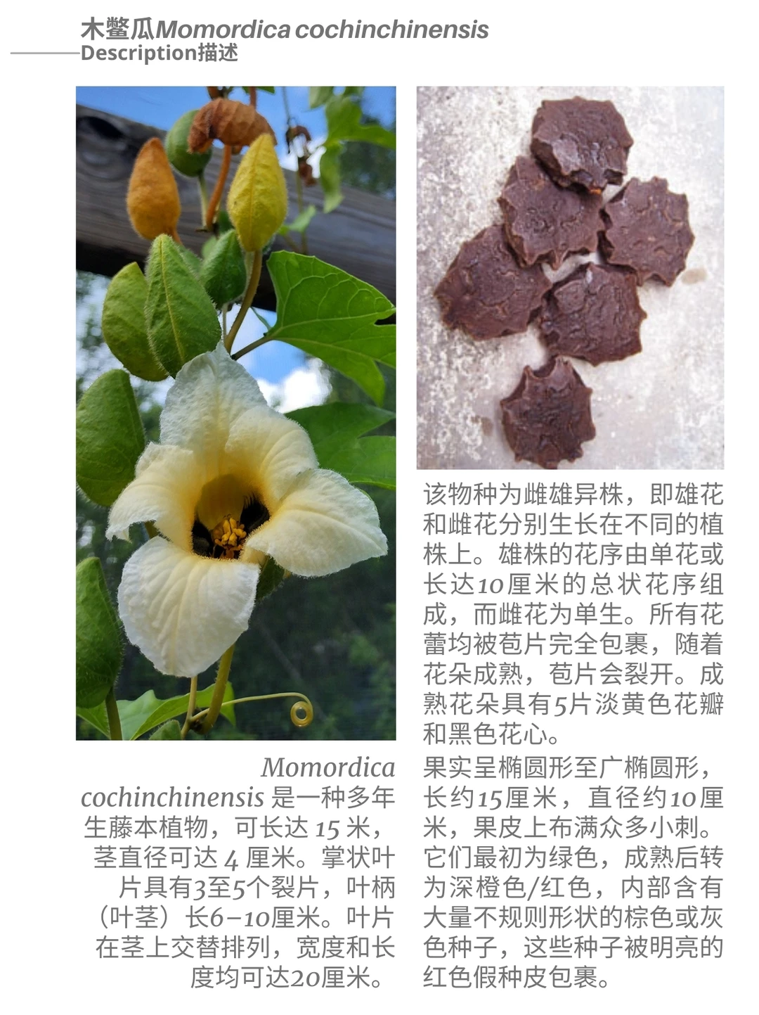 Momordica cochinchinensis 是一种多年生藤本植物,可长达 15 米,茎直径可达 4 厘米。掌状叶片具有3至5个裂片,叶柄(叶茎)长6–10厘米。叶片在茎上交替排列,宽度和长度均可达20厘米。