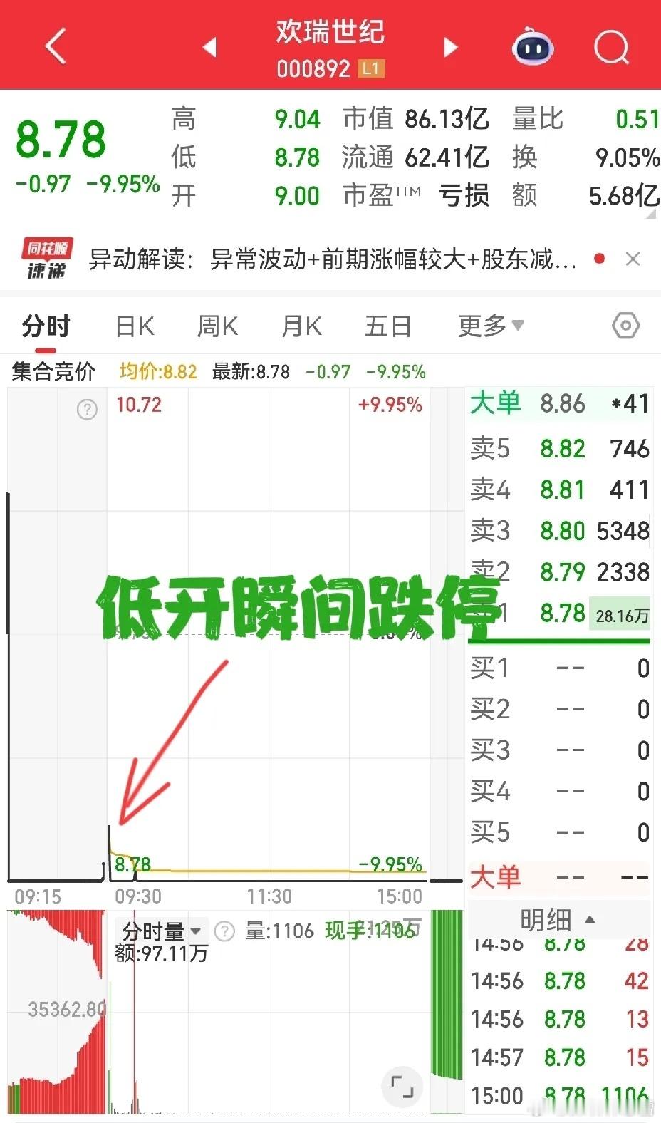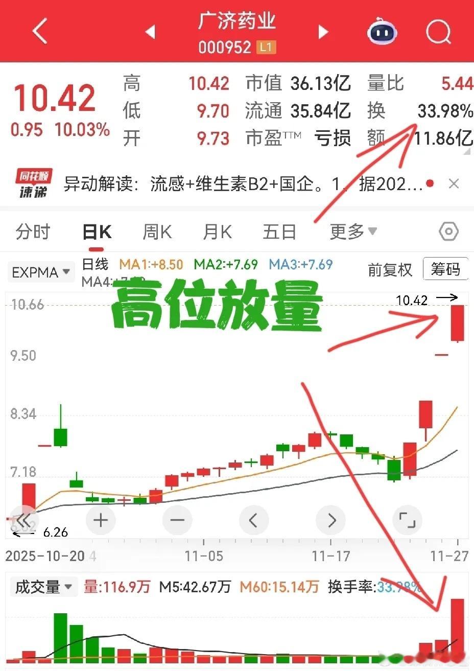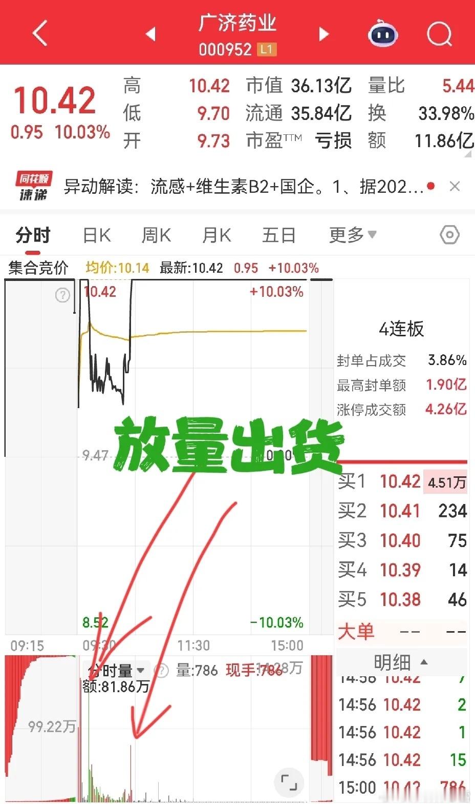 欢瑞世纪的剧本,广济药业正在重演?欢瑞世纪四连板巨量炸板再回封,次日低开跌停锁仓,主力早已借昨日换手出货;今日广济药业开盘对倒涨停后反复拉扯、价格直线波动,出货信号明显。明日需格外谨慎,“防人之心不可无”,切勿盲目跟风追高~ 个人观点,仅供参考!