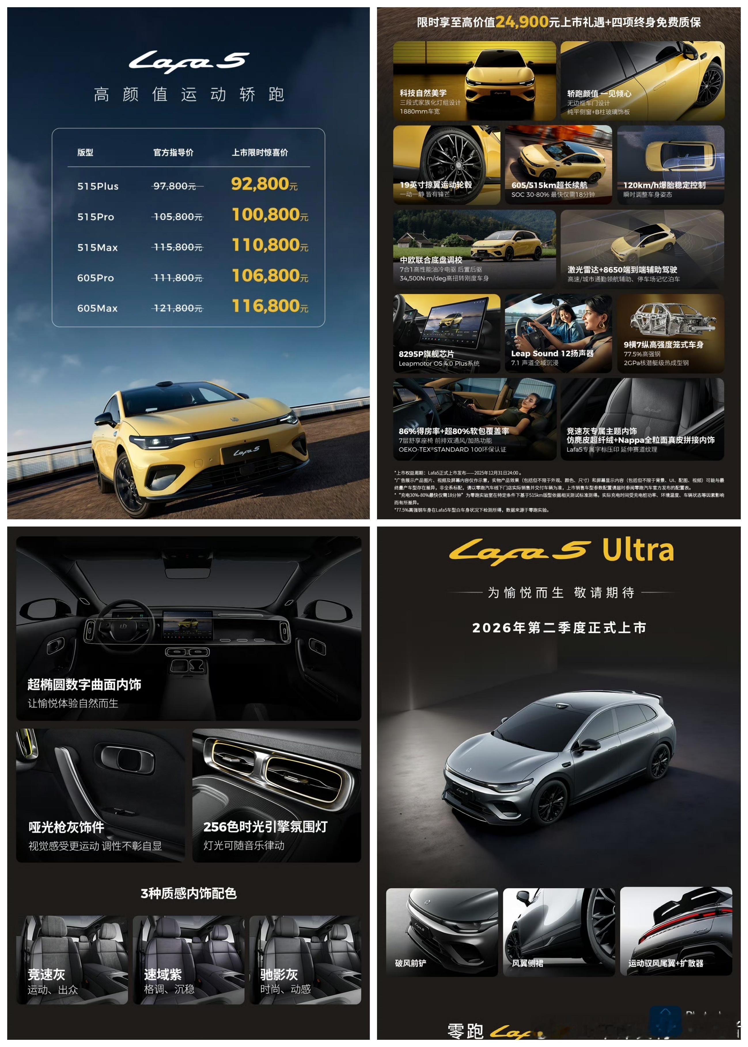 零跑Lafa5国内正式上市,它一共有五个配置,限时售价9.28万元至11.68万元,激光雷达都打入到12万以内就啊,我是很佩服的。发布会对比竞品特斯拉Model 3、领克Z20、比亚迪海报06 GT以及大众高尔夫GTI,大家觉得零跑Lafa5怎么样?