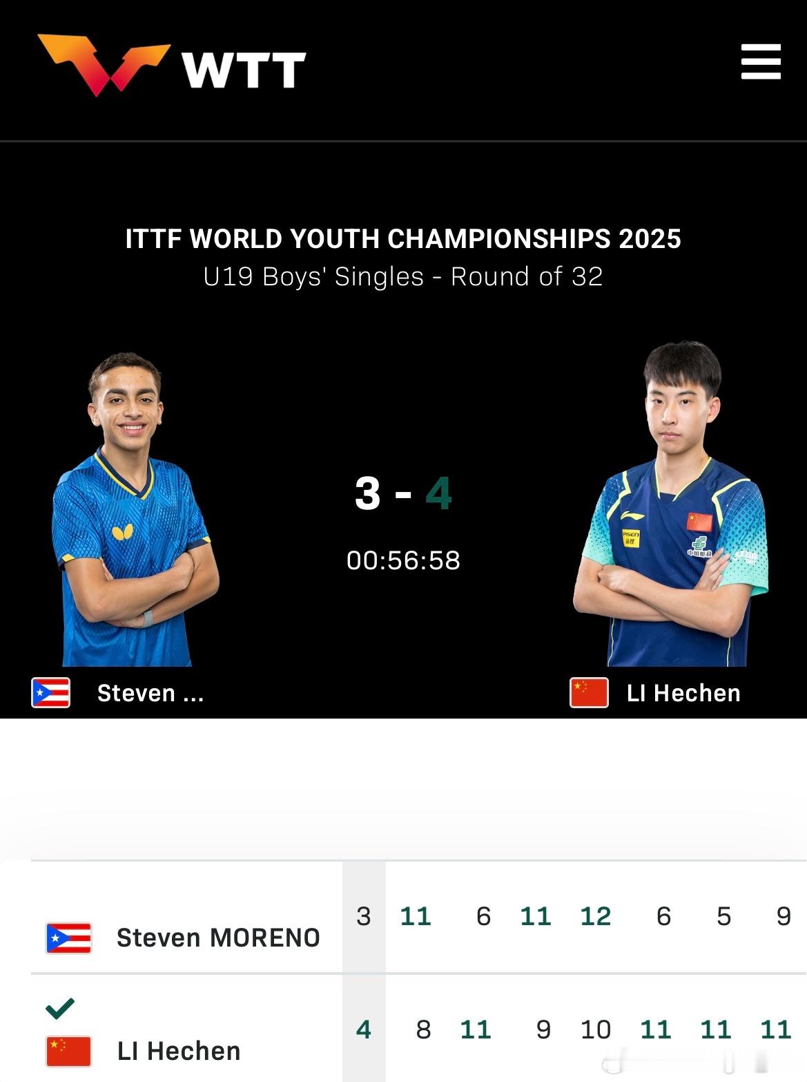 2025年国际乒联世青赛 U19男单1/16决赛🇨🇳李和宸4比3史蒂文·莫雷诺🇵🇷(8-11,11-6,9-11,10-12,11-6,11-5,11-9)下一轮🆚金佳温🇰🇷