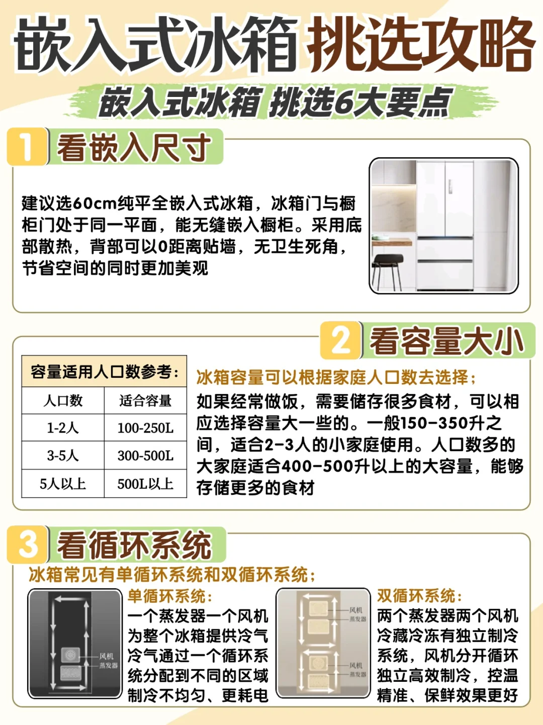 嵌入式冰箱想要做到安装后齐平橱柜,尽量选择60cm纯平全嵌设计,能够让冰箱与橱柜完美融合,底部散热,无需预留散热空间,节省厨房空间的同时更加美观,特别适合小户型或空间有限的家庭👍