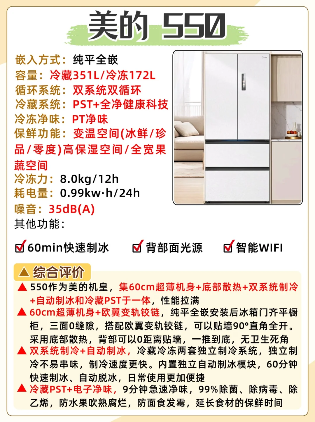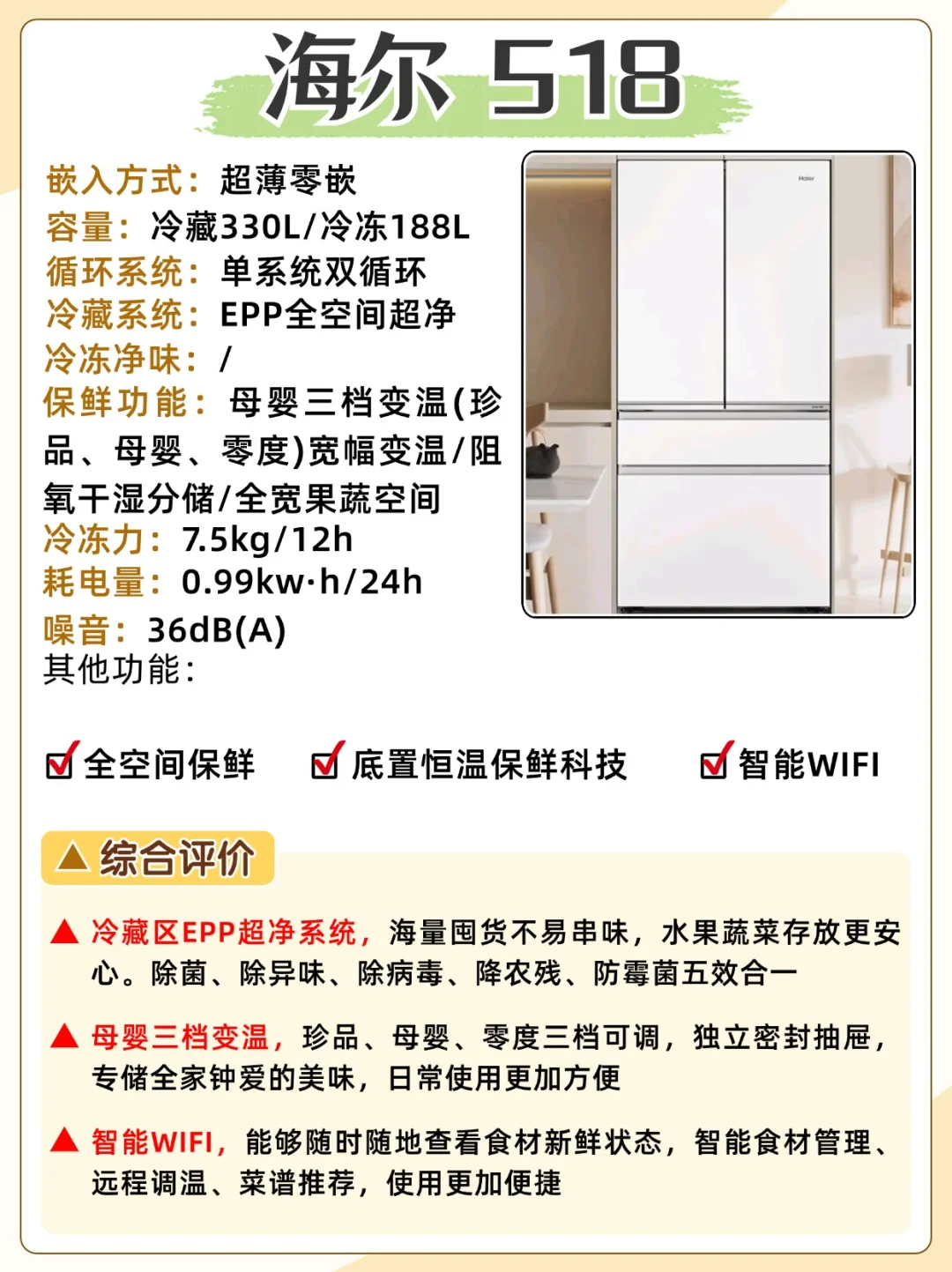 建议选60cm纯平全嵌入式冰箱,冰箱门与橱柜门处于同一平面,能无缝嵌入橱柜。采用底部散热,背部可以0距离贴墙,无卫生死角,节省空间的同时更加美观