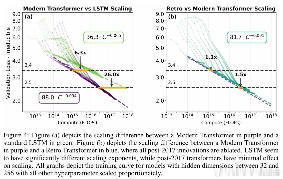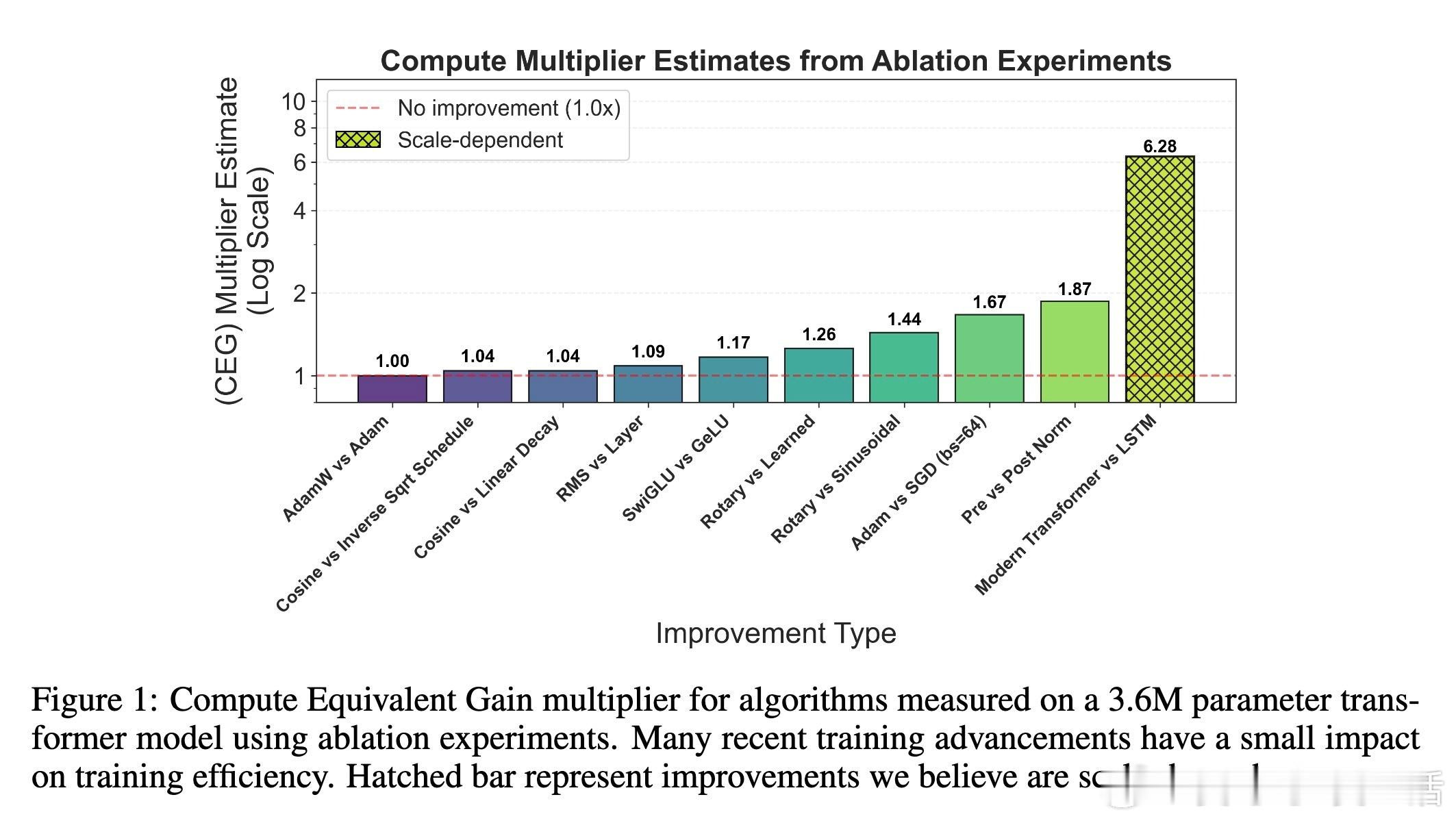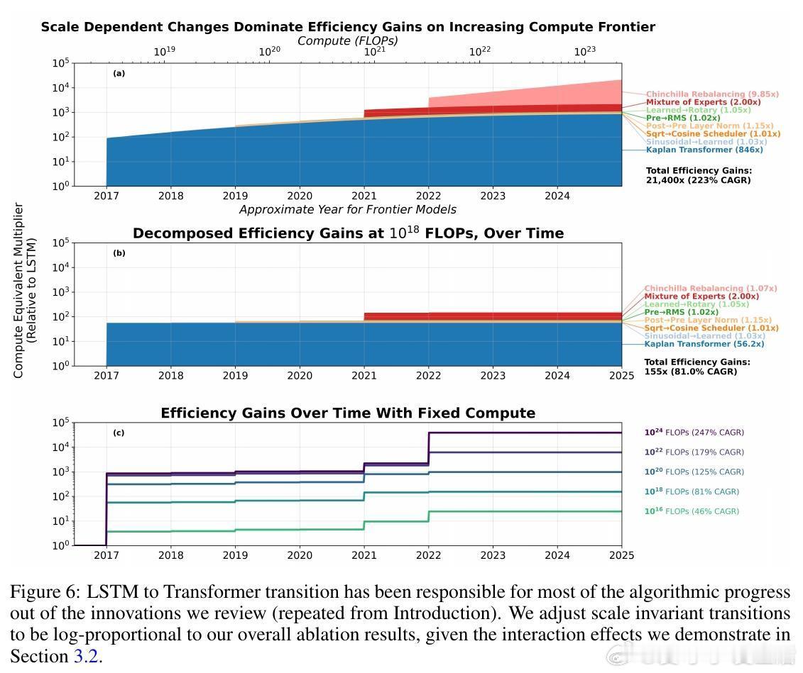 [LG]《On the Origin of Algorithmic Progress in AI》H Gundlach, A Fogelson, J Lynch, A Trisovic... [MIT FutureTech, CSAIL] (2025) 过去十年,AI算法效率被估计提升了2.2万倍,但我们的实验发现,关键创新的直接贡献不足10倍,文献中其他创新估计加起来也不到10倍,总计远低于此前预期。通过规模实验,我们发现大部分效率提升源自“规模依赖”算法,尤其是从LSTM到Transformer的架构转变,以及Kaplan到Chinchilla的规模重平衡,这两者合计解释了超过90%的效率跃升。本文提出了“计算等效增益函数”(CEG函数)概念,强调算法进步的效果强烈依赖于计算规模和参考算法。简单叠加小创新往往高估效益,且算法进步在小规模模型上表现缓慢,真正的飞跃出现在大规模时,这意味着大玩家从算法进步中获益更大。具体来看:- 绝大多数小规模模型上的算法改进(激活函数、位置编码、学习率调度、归一化、优化器)带来的效率提升有限,且相互作用并非乘法叠加。- LSTM与Transformer的比较显示,Transformer具有更优的计算扩展指数,规模越大优势越明显。- Kaplan到Chinchilla的训练数据与参数比例调整带来了显著的规模依赖性效率提升。- 不同参考点导致对算法进步的测量结果差异巨大:相对于LSTM,现代模型进步显著,但相对于现代Transformer,进步则微乎其微。- 算法效率提升不能脱离计算投入单独看,计算资源增长驱动了大部分所谓的算法进步。- 数据选择、Tokenizer改进、混合专家模型等也贡献了一定提升,但受限于实验规模难以精确量化。这意味着,未来AI算法进步可能更多依赖于新的大型架构突破,而非持续的小改进;同时算力限制可能阻碍算法进步的实现。算法创新对大规模模型开发者尤为关键,可能加剧玩家间差距。我们也提醒不要简单依赖单一的FLOP效率指标,而应综合考虑稳定性、泛化能力和部署成本等多维度因素。总之,算法进步的真相是:规模改变游戏规则,真正的质变在于“规模依赖”的架构跃迁,而非线性叠加的微小优化。这为AI未来的发展路径和资源投入提供了新的视角和警示。全文详见:arxiv.org/abs/2511.21622