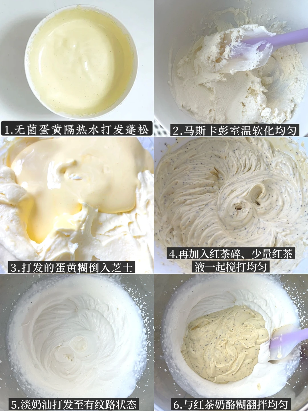 1️⃣ 蛋黄与细砂糖隔热水用电动打蛋器打发蓬松有纹路,与室温软化好的马斯卡彭奶酪搅拌均匀。