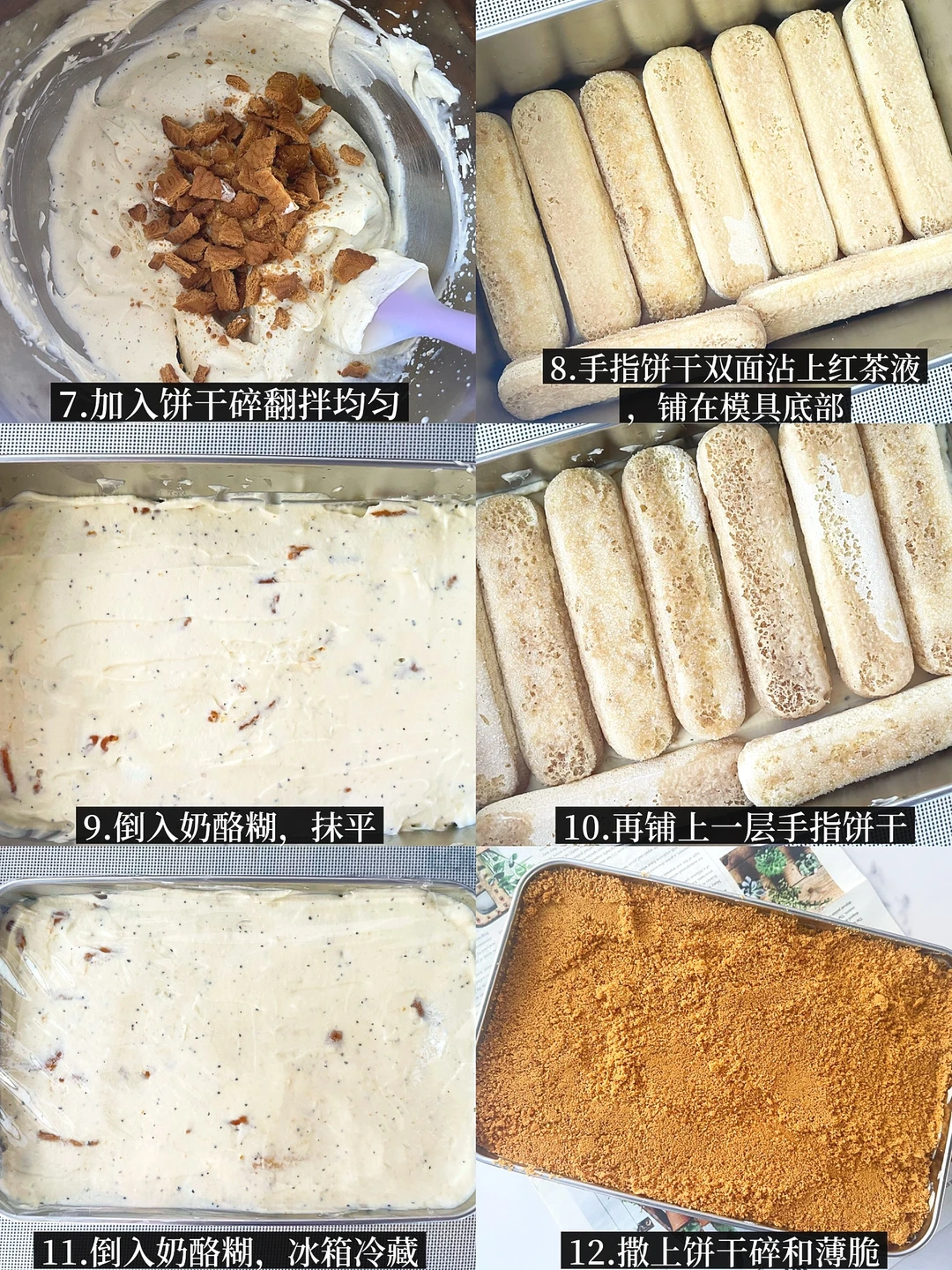 4️⃣100ml红茶液倒入容器里,手指饼干两面快速沾一下红茶液,放在提拉米苏盒子里,挤一层奶酪糊抹平,再铺一层手指饼干,挤一层奶酪糊抹平。保鲜膜密封放入冰箱冷藏4个小时以上。