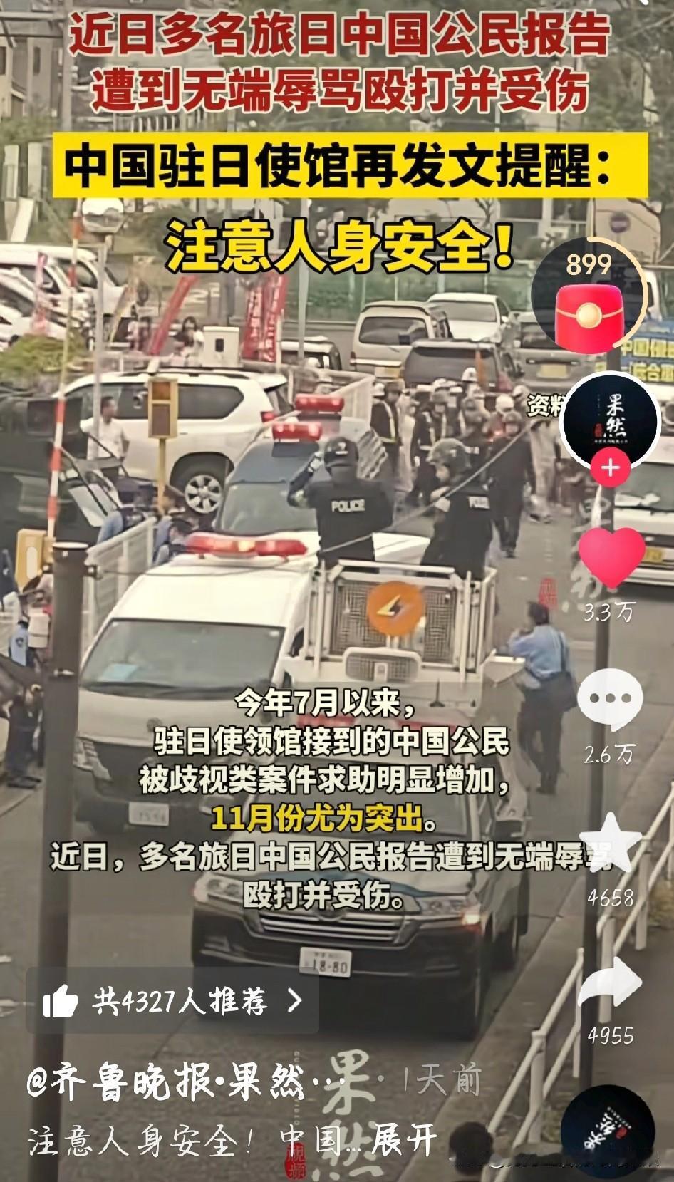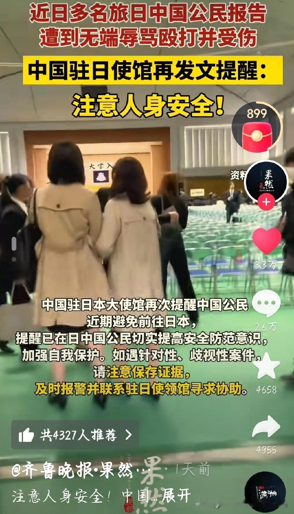 太气人!旅日同胞遭无端打骂,使馆紧急提醒:近期别去日本! 最近看到旅日同胞的遭遇,真是又气又心疼!不少中国人在日本好好走着路、说句话,就被无端辱骂殴打,有的还受了伤,甚至有留学生被围殴断了肋骨 。 更让人上火的是,好多案子至今没侦破,施暴的人还没受到惩罚 。这阵子日本针对中国人的恶意事件越来越多,右翼分子煽风点火,网上全是极端言论,安全形势越来越差 。 中国驻日使馆都再三发文提醒了,让近期别去日本,在日的同胞也得提高警惕,晚上别单独出门,少去偏僻地方 。要是真遇上事儿,一定记得保存证据、赶紧报警,再联系使馆求助。 咱出门是为了生活或游玩,不是受气挨打的!日方得赶紧管管,严惩凶手,保护好中国公民的安全,别寒了大家的心! 中国驻日使馆再发文提醒注意人身安全 中日关系 当前国际局势 没必要不去日本 图片截图于网络