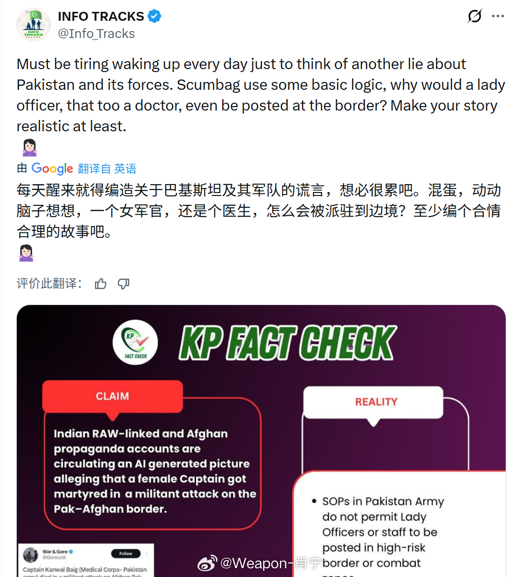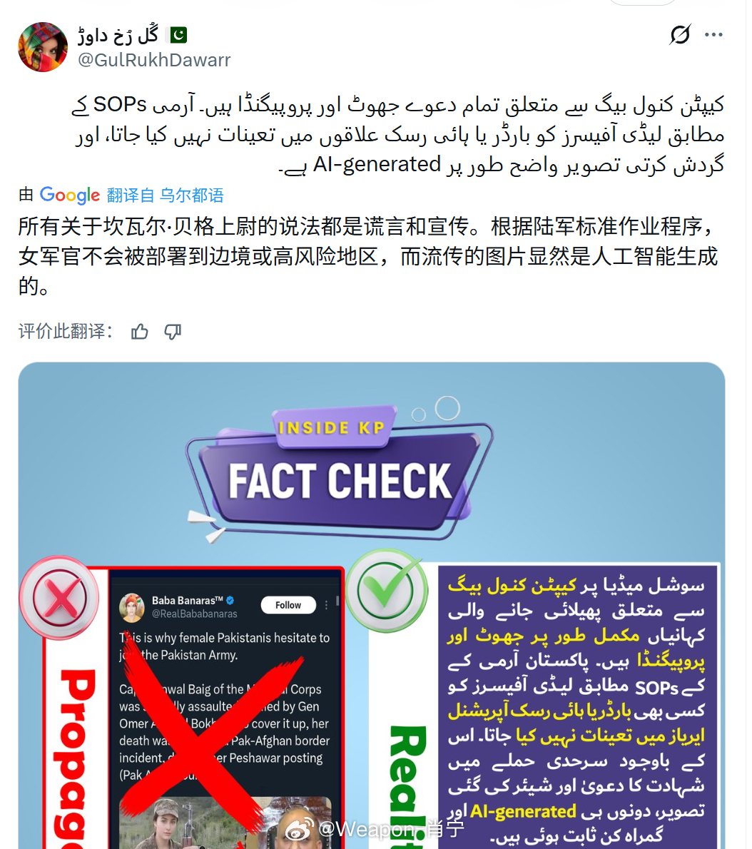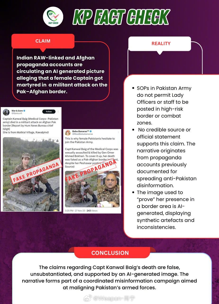 烽火问鼎计划 印巴认知作战实例:与印度调查分析局(情报机构)有关联的宣传账户及阿富汗账号正在传播一张AI生成的图片,声称一名女上尉在巴基斯坦-阿富汗边境的武装袭击中殉职。据称:· 坎瓦尔·拜格上尉(巴基斯坦陆军医疗队)在阿富汗-巴基斯坦边境的武装袭击中丧生(由Hum新闻社吉尔吉尔分社首席记者报道)· 她来自拉瓦尔品第的Matkial村。而印度网络用户Baba Banaras则称:“这就是巴基斯坦女性不愿参军的原因。医疗队的坎瓦尔·拜格上尉遭到奥马尔·艾哈迈德·博哈里将军的性侵和谋杀。为掩盖真相,尽管她实际派驻在白沙瓦,其死亡被伪装成巴阿边境事件(巴基斯坦消息源)”而事实上 巴基斯坦军队标准流程禁止女性军官或工作人员派驻高风险边境或作战区域· 没有任何可信来源或官方声明支持这一说法。该叙述源自此前已被记录在案传播反巴基斯坦虚假信息的宣传账户· 用于“证明”其在边境地区存在的图片系AI生成,该谣言是旨在抹黑巴基斯坦武装部队的协同造谣行动组成部分。