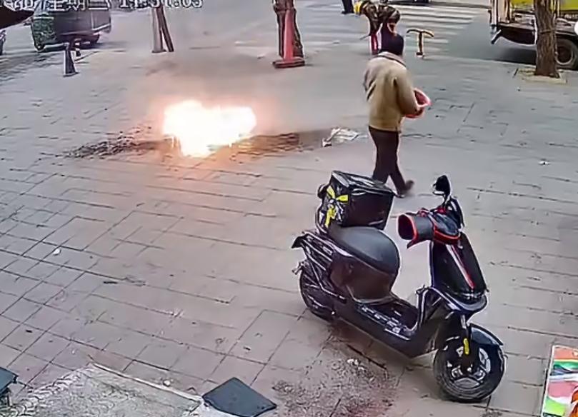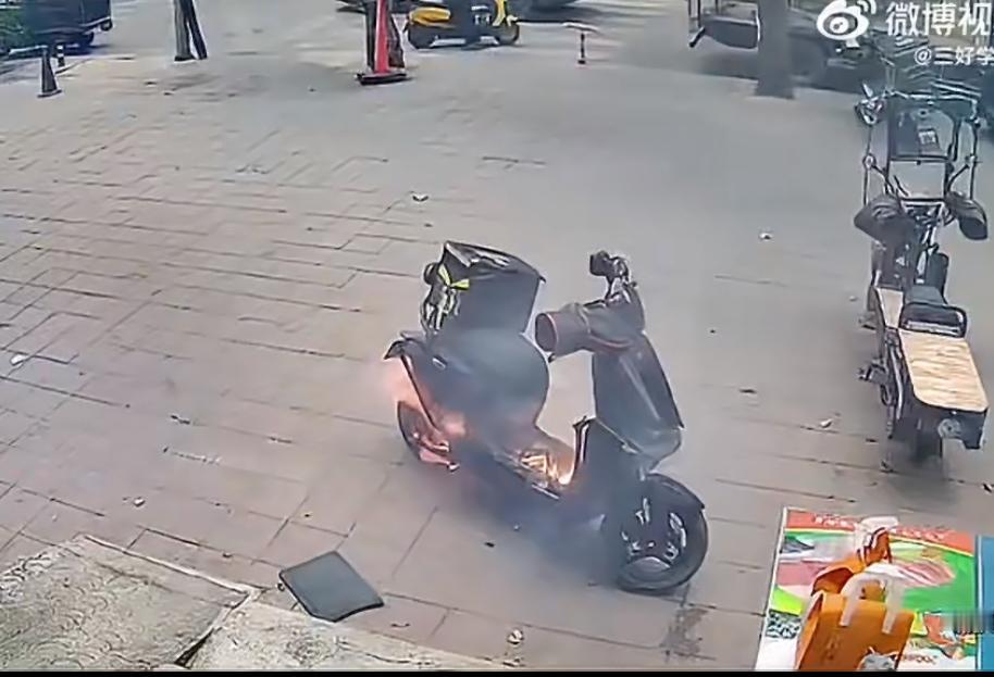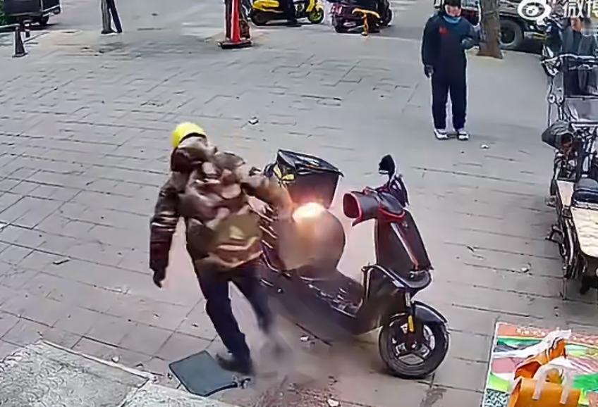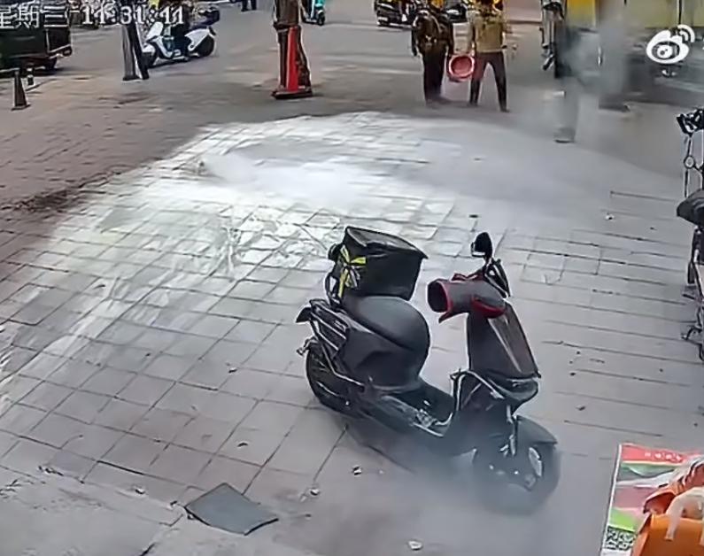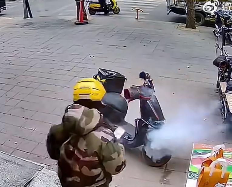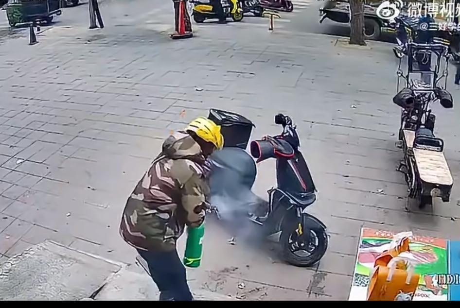 完整记录一起外卖小哥电瓶起火事故,他骑的车在马路牙子磕了一下,停下不到2秒钟,电瓶开始冒烟,接着冒大火,小哥用灭火器降了一下温,徒手把电瓶摘出来,避免车架被烧,勇敢啊。把电瓶丢在空地,周围的人一起帮忙灭火,万幸没有造成事故。所以,电瓶一定要避免磕碰。