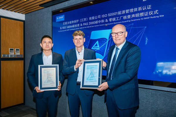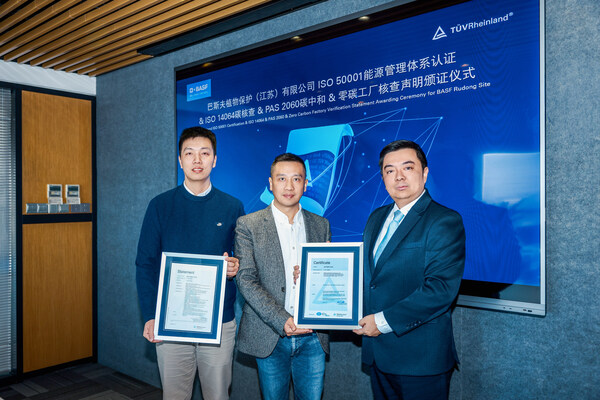 上海2025年11月28日/美通社/--日前,国际独立第三方检测、检验和认证机构德国莱茵TÜV大中华区(简称"TÜV莱茵")为巴斯夫植物保护(江苏)有限公司(简称"巴斯夫如东基地")颁发了ISO50001能源管理体系认证证书、ISO14064组织层面温室气体核查(即碳核查)声明、PAS2060碳中和声明以及"零碳工厂"核查声明。