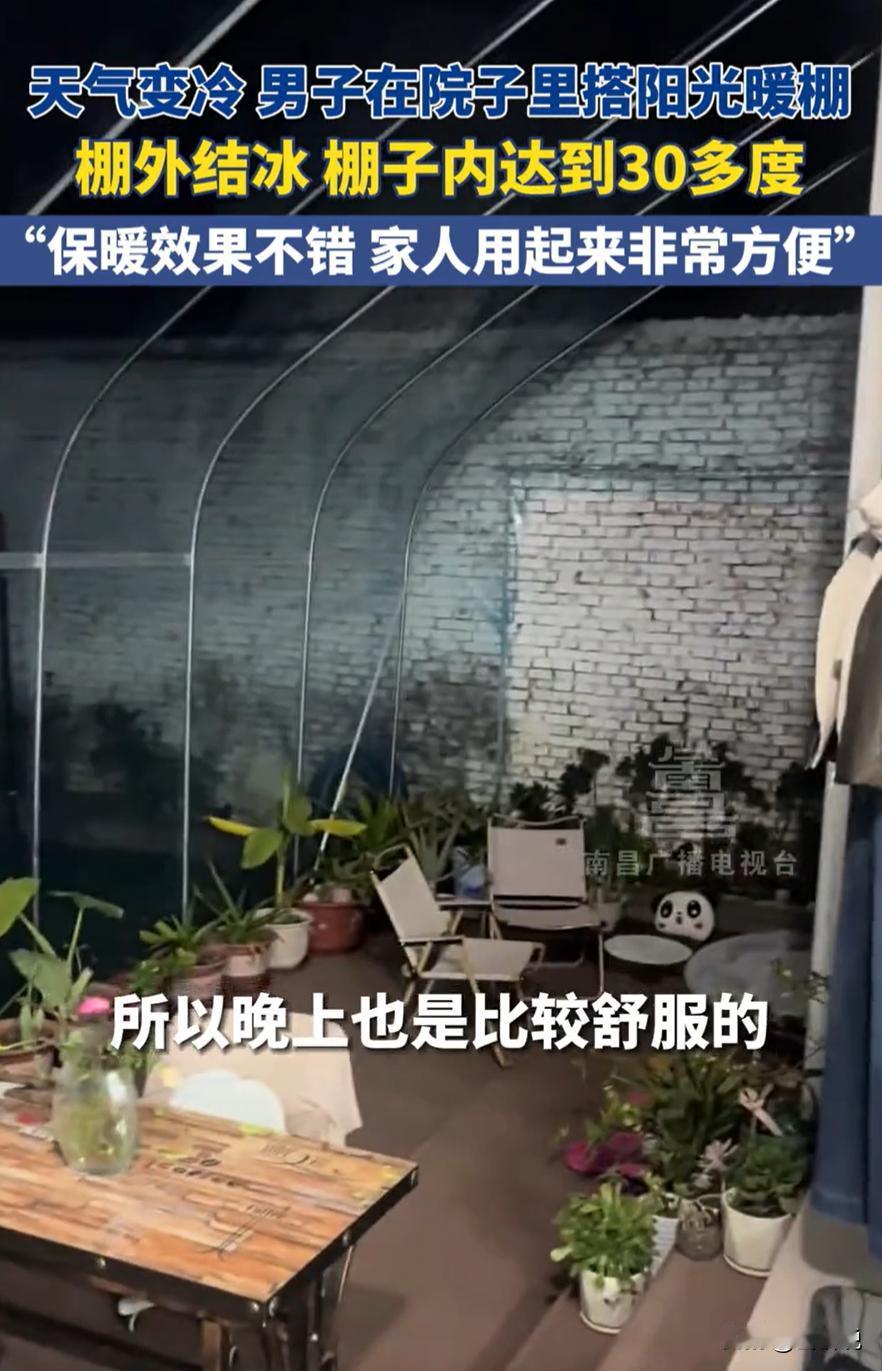 这是真聪明!河北石家庄,天气变冷后,一男子突发奇想在院子里花1000多块钱搭了一个阳光暖棚,没想到效果出奇的好,棚外的水都结冰了,棚里面最高却能达到30多度,网友:这不会有味道吗? 男子介绍,他住的房子是一个四大间,因为最近天气降温,老人又不舍得开空调,所以他就想着怎么能把屋子弄得暖和一点,后来刚好刷视频看到东北的暖棚,于是就花钱弄了一个 本来就想着试试看,也没抱太大的希望,结果安装后效果很好,白天有阳光的时候,棚里面能达到三四十度,把屋里面也给顺带暖和了,而到了晚上,里面还有余温 有网友说:这塑料棚子太阳一晒,会不会有味道?时间长了会不会闷? 其实这就要分开说了,塑料味从哪儿来,主要取决于材料质量。便宜薄膜在高温下确实容易散点味儿,但正规耐晒膜本身的稳定性更高,晒热了味道也比较轻,一般开个缝、通个风就能散掉。暖棚这种结构,本身就是靠阳光升温,又不是把人关里面长住,所以大家想象的那种呛鼻子味儿往往没那么夸张 至于闷不闷,这要看怎么用。棚子如果一天到晚密封,那肯定空气不流通,热是热了,人进去会觉得憋。大多数人用暖棚是让它帮忙蓄热,再引进室内,不是让人长期呆在棚里。所以开关棚门、留通风口,是基本操作。太阳一落山温度下来得也快,白天吸热、晚上散热,这种节奏不会一直焖着 当然,这种做法不一定适合所有家庭。比如城市楼房就没院子可搭,北方有些地区日照不足可能效果会打折扣