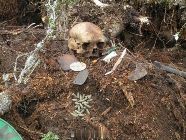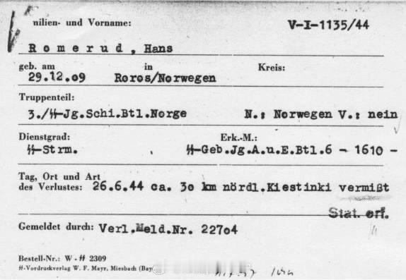 烽火问鼎计划 一名挪威纳粹的故事第一张照片摄于1942年,图中挪威党卫军志愿兵汉斯·克里斯蒂安·罗默鲁德手持一名苏联红军战士的头骨。据目击者称,他打算将其制成烛台或烟灰缸。下一张照片中则是罗默鲁德本人的头骨,于2006年6月25日被发现——此时距他死亡已过去62年。1944年6月24日,罗默鲁德在受伤后为免被第205极地步兵师第571团的红军战士俘虏而开枪自尽。当日,该团将士将党卫军部队逐出了卡普罗拉特高地。在那场激战后,党卫军"诺德"营300名士兵中幸存者不足半数。照片中可见其右侧太阳穴的弹孔、射击后的弹壳及其个人身份标识牌。第571团的各营从西侧正面强攻卡普罗拉特高地,由于德军布设的地雷在冬季埋设后未在春季重新掩埋,我军战士得以清晰辨识并穿越雷区。通过猛烈进攻,红军将挪威守军逐出防御工事,部分党卫军士兵溃退至扎谢伊卡方向(其逃窜距离之远,需借助芬军才得以寻回并重整)。约25人在入夜前突围至邻近的哈塞尔曼山丘与友军会合。这座在苏军文件中被称为"陡峭"的山丘于6月26日15时展开攻坚。极地步兵师各部从多个坡向发起数次血战。据少数幸存挪威士兵之一、士官雅德尔的报告称:战斗最初几分钟内,营长阿克塞尔·斯蒂尔少校与连长奥拉夫·马格努森中尉相继阵亡,这使防御局势陷入绝境。更棘手的是,接替指挥的雅德尔遭遇抗命:据守仓库掩体的一群挪威猎兵三次拒绝持械,声称"这场战争对我们已结束"。雅德尔证言中描述,俄军队伍中"有蒙古人种士兵"不顾伤亡猛攻:在倾角达45度的东坡,超过200名进攻者在九挺重机枪的毁灭性火力下牺牲。对山丘的围攻从三面持续三小时,最终以残酷的白刃战告终——战壕、永备工事和掩体中的敌军均遭刺刀、手榴弹与喷火器肃清。据雅德尔所述,部分挪威士兵佯装突围,用俄语高呼"乌拉!斯大林万岁!",而俄军在冲锋时则用德语呼喊"别开枪!我们是德国士兵!"。雅德尔与三名战友侥幸泅渡湖泊逃生。研究者与搜救人员评估,在这片约三平方公里的战场上,双方阵亡者超过600人:极地步兵师约400-450名将士牺牲,142名挪威志愿兵战死或失踪(38人被俘)。试图增援被困友军的德军也遭受重大伤亡。