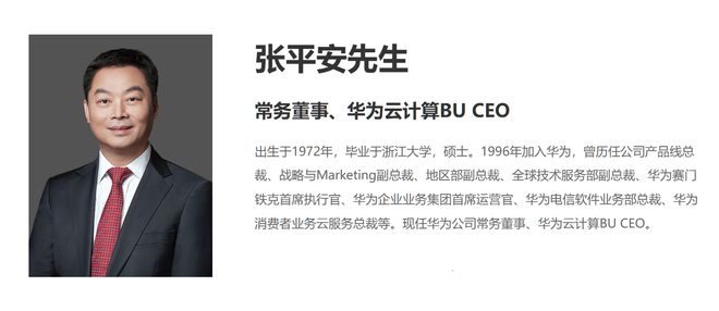 张平安于2021年5月担任华为常务董事、华为云CEO,根据华为官网信息,张平安出生于1972年,毕业于浙江大学,1996年加入华为,曾历任公司产品线总裁、战略与Marketing副总裁、地区部副总裁、全球技术服务部副总裁、华为赛门铁克首席执行官、华为企业业务集团首席运营官、华为电信软件业务部总裁、华为消费者业务云服务总裁等。