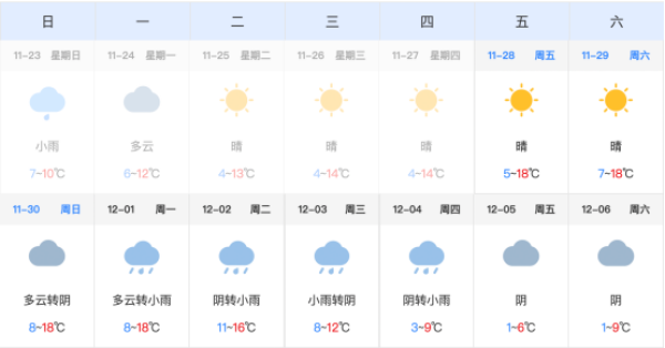 (三)根据气象部门发布的天气预报,贵阳市11月29日(周六)天气晴朗、11月30日(周日)天气为多云转阴,气温在7-18度之间,请提前关注天气预报,注意保暖。
