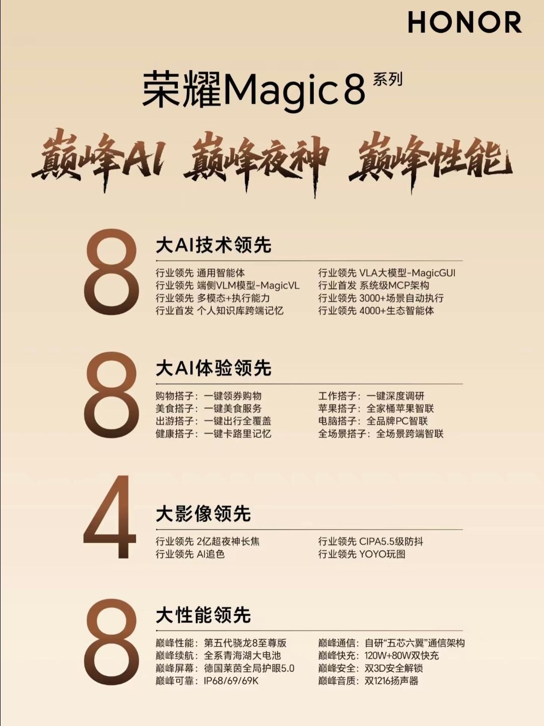 荣耀Magic8防抖+长焦双 buff,抓拍再也不糊 谁懂啊!旅行时想拍云海翻涌、街头艺人弹唱,要么手抖拍糊,要么远了拍不清,遗憾到跺脚!直到用上荣耀Magic8,才算解锁了真正的抓拍自由~ 它的 CIPA 5.0 级防抖是真硬核,徒步迎风拍风景不用找支架,画面稳到离谱,云卷云舒的细节全拿捏;6400 万潜望长焦更是惊喜,十几米外追拍艺人,琴弦震颤、眉眼神情都清晰可见。白天拍风光色彩自然,晚上靠超夜算法,暗部细节也不丢失,随手一拍都是能发圈的大片。 兼顾防抖、长焦和全场景出片,加上7000mAh大电池续航在线,旅行带它真的太省心,难怪口碑爆棚!荣耀Magic8 荣耀Magic8 Pro 荣耀Magic8系列 性能专家 数码配置
