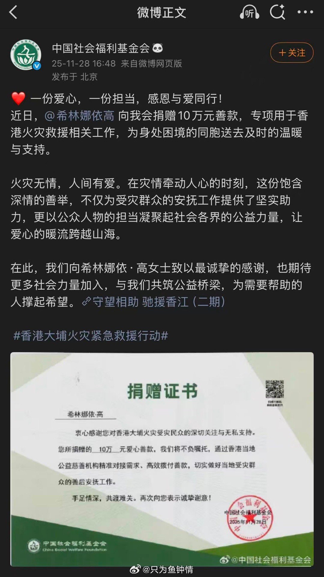 从特区政府的紧急部署到民间的自发援助,香港用团结对抗灾情。捐款10万元响应驰援行动,用善举连接同胞情谊,以担当诠释艺人初心。愿这份温暖跨越山海,让香江早日重现往日繁华!希林娜依高驰援香港
