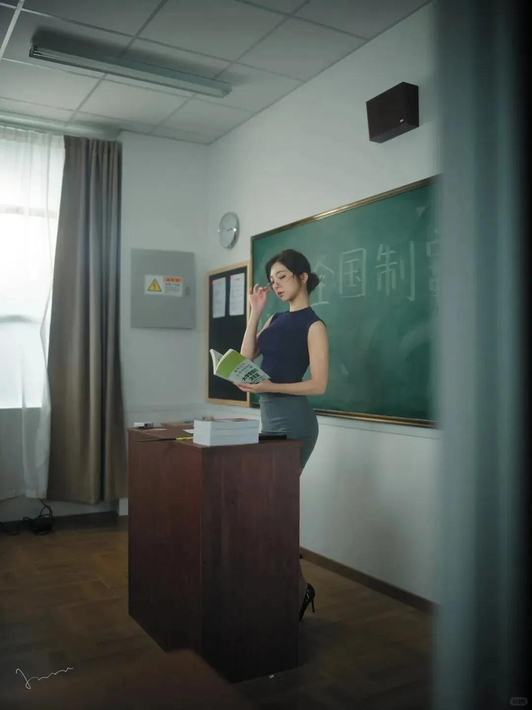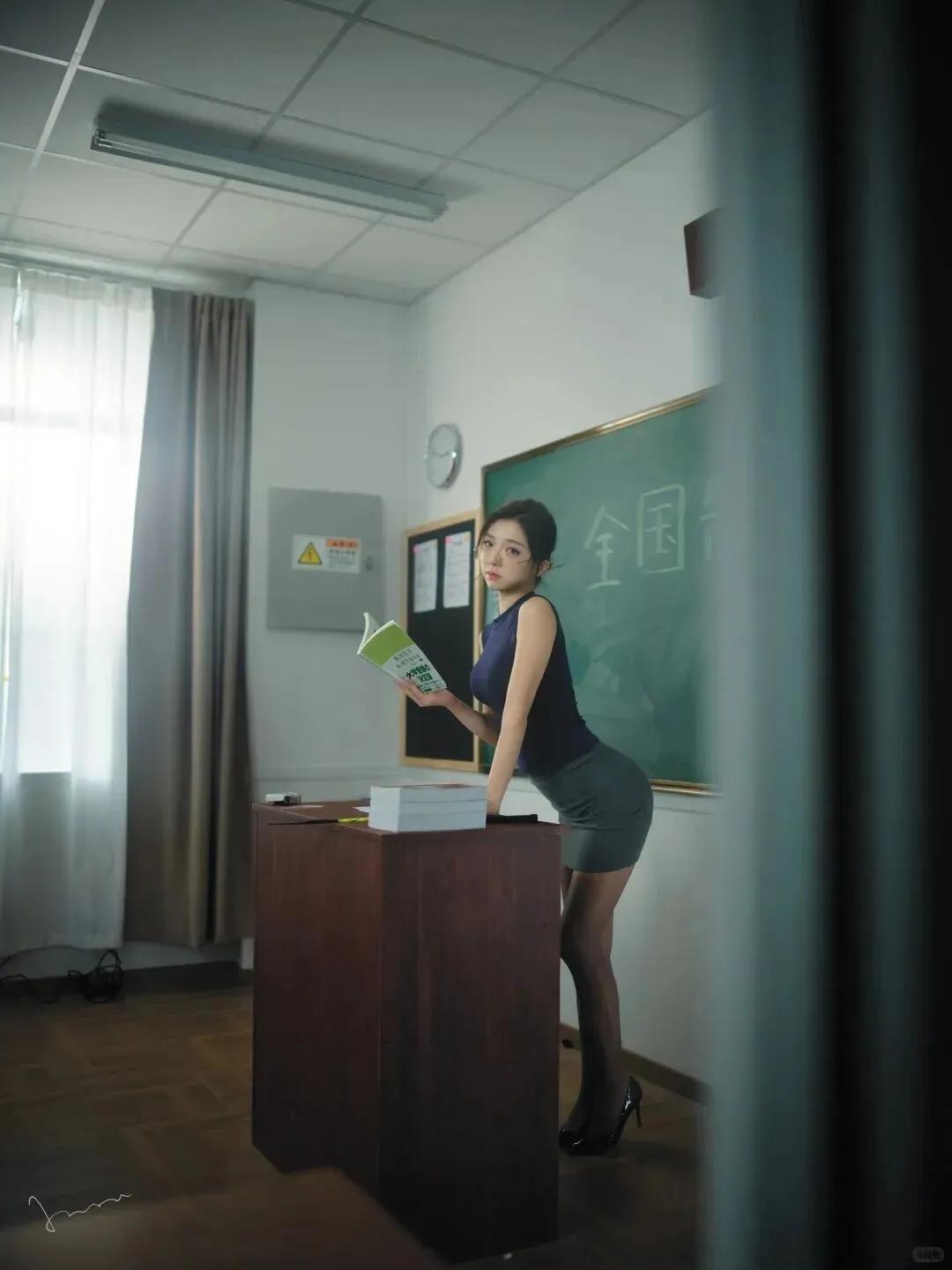 在洒满轻柔光线的教室,墨绿色黑板泛着哑光,木质讲台纹理清晰,空气中弥漫着淡淡的书卷气,悄然晕染出知性的职场氛围。她身着藏蓝无袖上衣,利落剪裁勾勒出干练线条,下搭灰色包臀裙尽显优雅,黑丝与尖头高跟鞋的搭配,为整体造型注入精致感,手中紧握着的书本与文件,更成为她职业角色的生动注解。