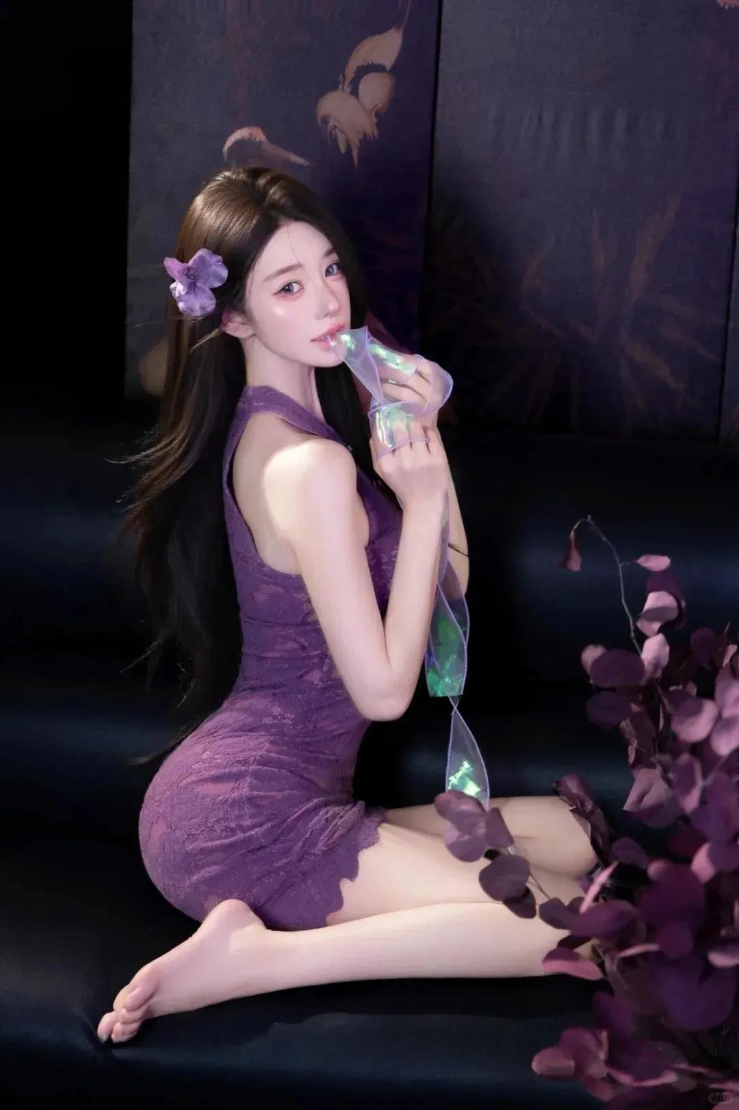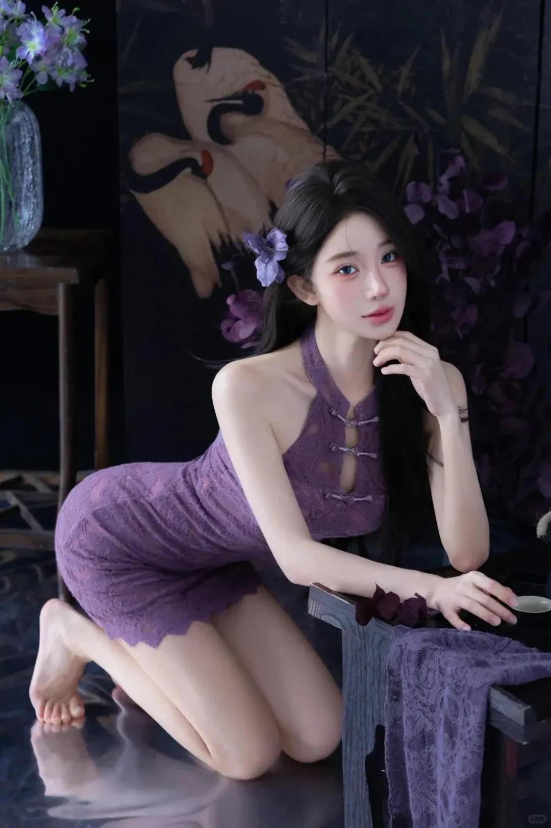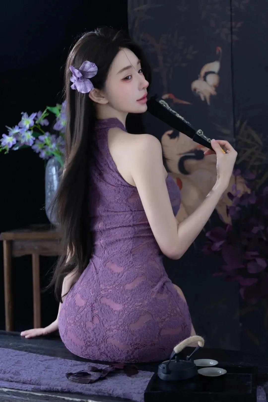东方空间的雅致与她的紫韵旗袍相互交融,领口的盘扣缀着细碎珍珠,裙摆流转间似有紫雾轻漾。她抬袖整理鬓发,转身轻倚木栏,每一个动作姿态,都像是在这一方小天地里的风格独白。既有对云纹刺绣里古典韵味的细腻演绎,又饱含着对光影交织中浪漫诗意的精准捕捉,让这满是青瓷与墨画的场景,因她而充满了独特又迷人的风情。
