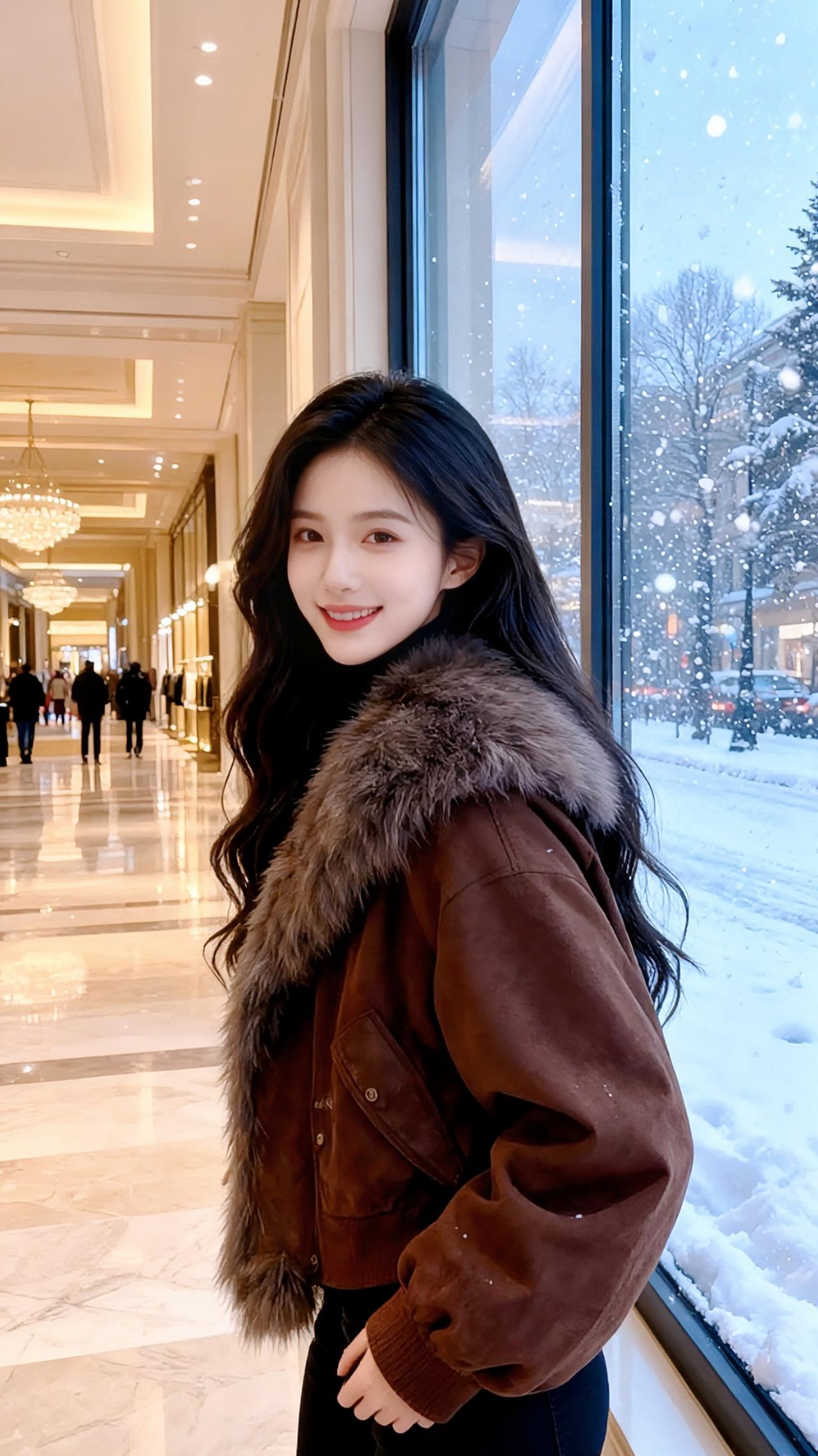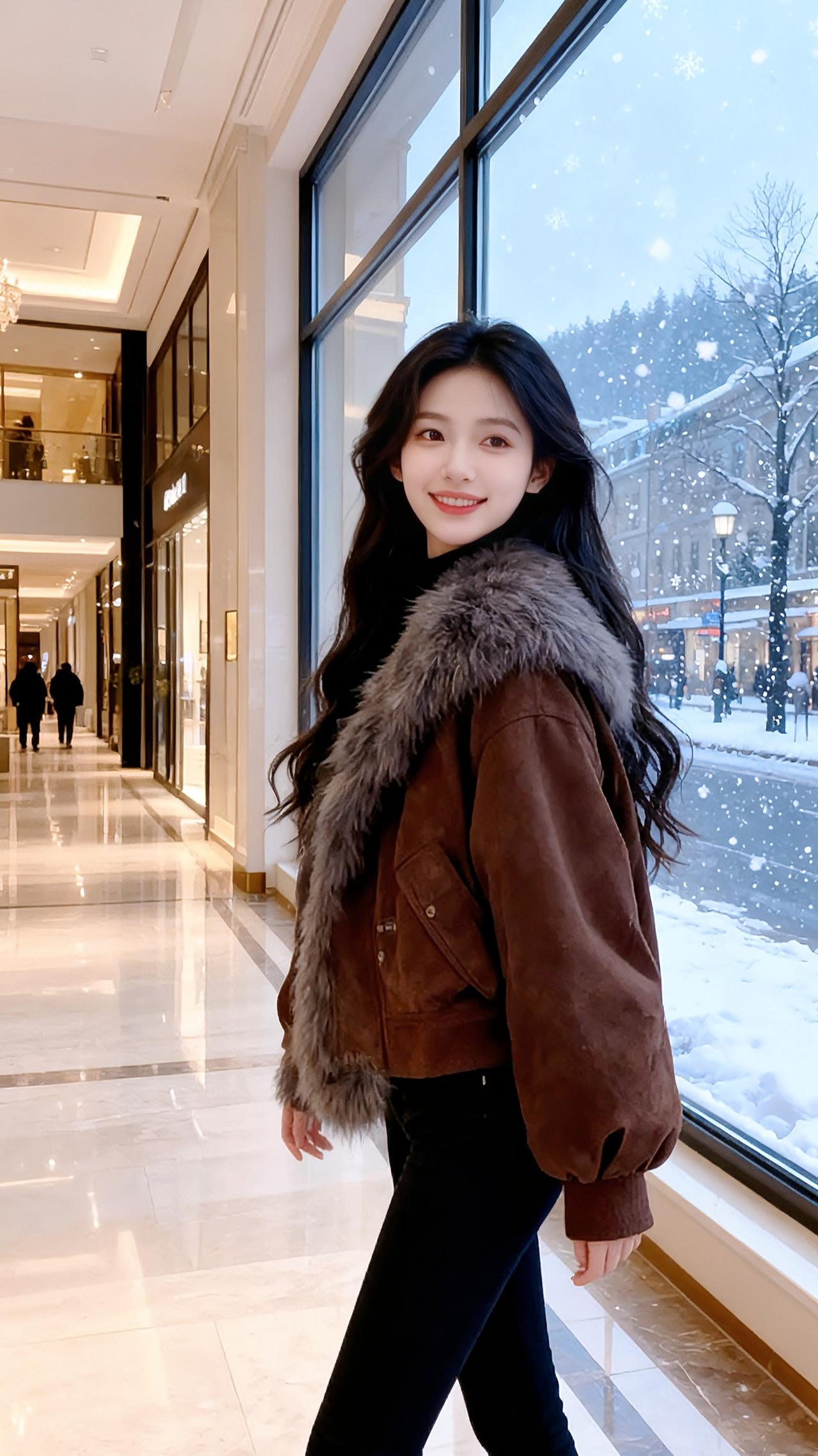 灰调的毛绒裹着初冬的暖意,她是商场流光里轻跃的风。 长发漫过肩线时,像把星子揉进了蓬松的绒里——转身是玻璃橱窗映出的软,抬手是发梢扫过耳廓的痒。黑裤裹着舒展的线条,腕间落进木色栏杆的光,连笑意都沾了点亮晶晶的甜,漫在亮堂的中庭里,成了季节里最软的那帧速写。 高级感穿搭