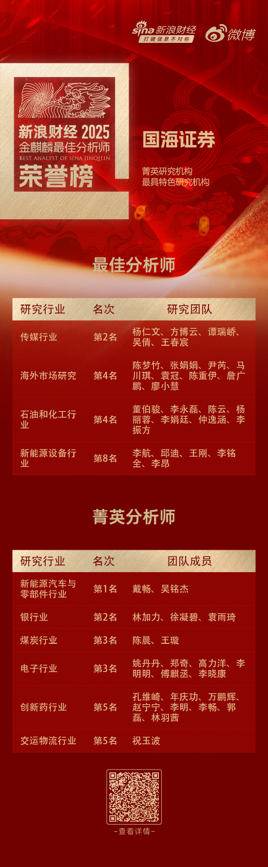 11月28日,第七届新浪财经金麒麟最佳分析师评选结果揭晓,国海证券研究团队荣获“最具特色研究机构第四名”、“菁英研究机构第三名”。