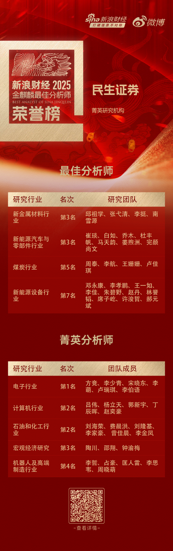 11月28日,第七届新浪财经金麒麟最佳分析师评选结果揭晓,民生证券研究团队荣获“菁英研究机构”第八名。