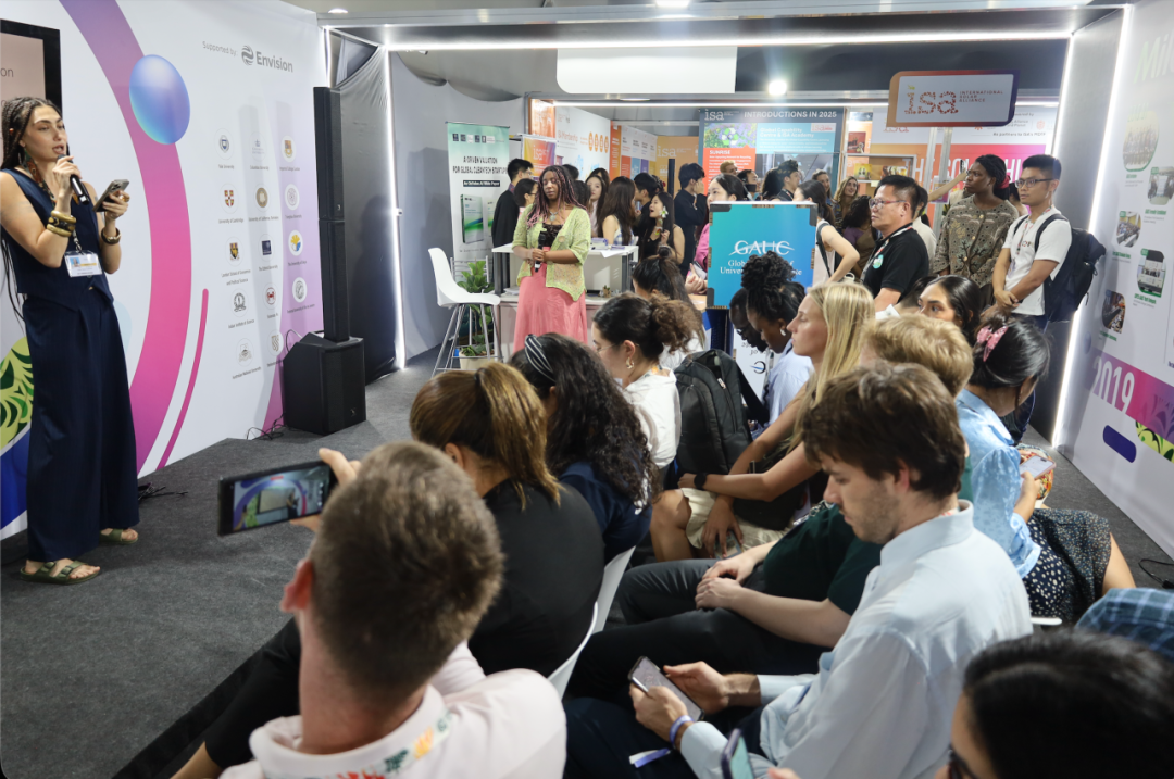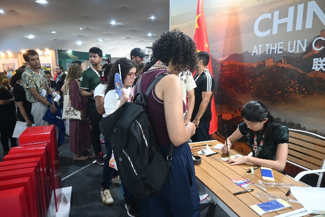 此外,青年们参与了中国角一系列丰富多彩的特色文化展示活动,GAUC青年大使通过书法写团扇、国画绘书签、气候桌游等体验项目,持续吸引各国嘉宾体验中国笔墨韵味,以传统文化为媒,传达低碳生活方式转型理念。