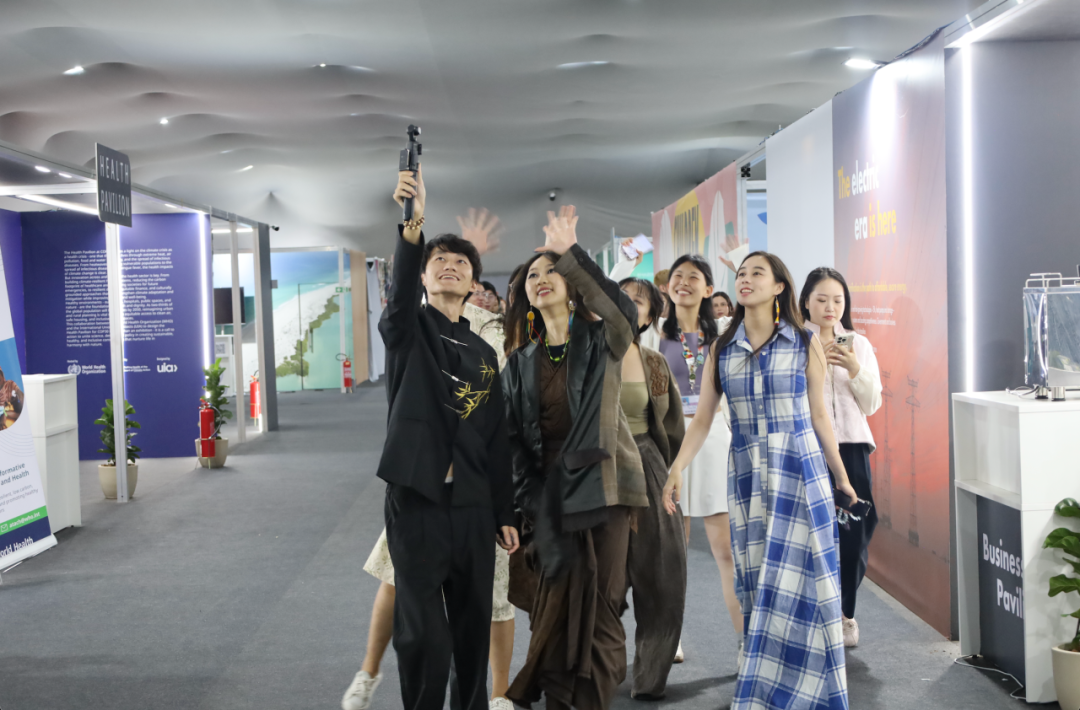 随后青年代表们组成巡游队伍,流畅穿梭在蓝区中国角、泰国角、马来西亚角等各大场馆之间,通过服饰这一无国界的语言彼此连接,践行可持续生活方式,传递青年群体打破文化隔阂、身体力行推动低碳转型的积极信号,展现应对气候变化不仅需要政策与技术,也需要渗透到衣食住行的生活方式变革中。