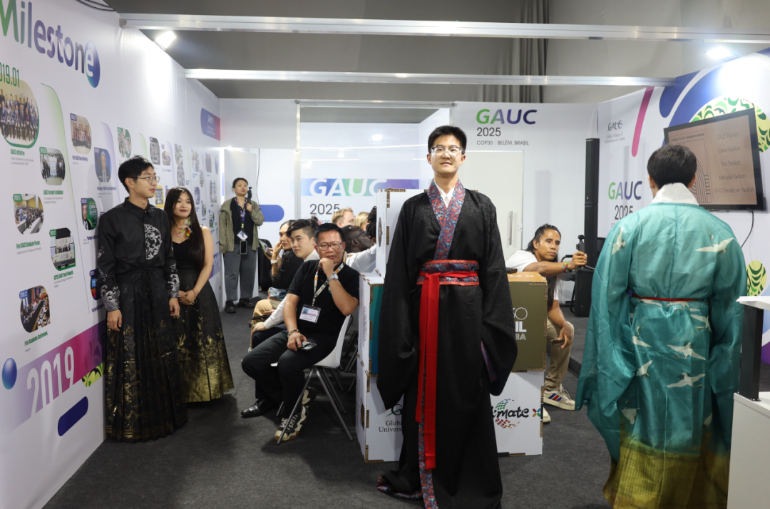活动由中国角、世界大学气候变化联盟角、泰国角、马来西亚角等多方联合举办。中国青年代表化身绿色风尚倡导者,身着服饰有的采用可降解材料或再生纤维,将循环经济的潜力化为触手可及的案例;有的把中国传统剪裁与现代低碳理念相缝合一隅,让东方美学演绎生态哲思。活动现场,代表们逐一讲解每件服饰的环保材质、减碳工艺与背后的绿色故事,吸引观众驻足喝彩。
