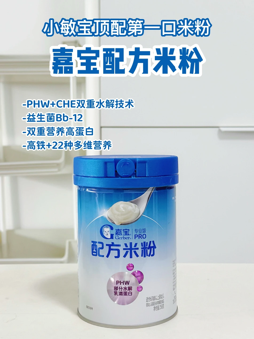 🔹和部分水解奶粉一个原理,将牛奶蛋白大分子水解成肽段小分子,对小敏感很友好。【嘉宝配方米粉】作为雀巢旗下的近百年品牌,全新开创米粉界“配方米粉”,而且还是奶粉同工厂生产,采用雀巢奶粉特色的【尖峰水解科技】既能降低蛋白敏敏性,又能为小敏感宝宝提供高质量蛋白营养;还搭配了CHE谷物水解工艺,将淀粉大分子水解成小分子,再加上活性益生菌Bb-12,吸收力配置优秀,妥妥减少宝宝肚肚负担。
