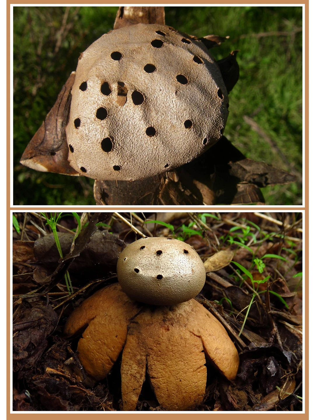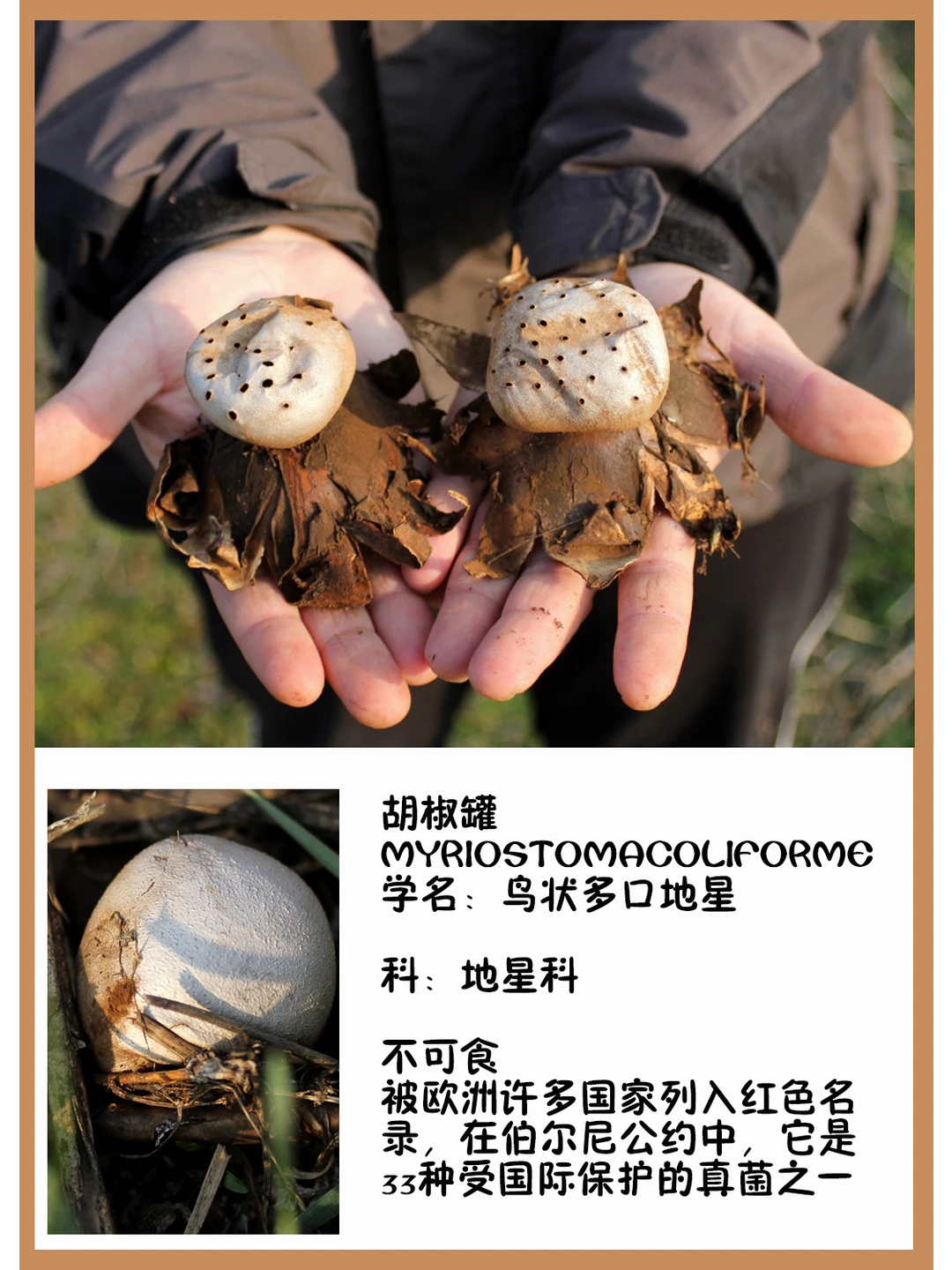 胡椒罐 Myriostomacoliforme 学名:鸟状多口地星 科:地星科 图片©manatarka.org 不可食 广泛分布于半沙漠地带,长久以来人们都认为它已经灭绝[哭惹R],直到2006年再次被发现 被欧洲许多国家列入红色名录,在伯尔尼公约中,它是33种受国际保护的真菌之一[飞吻R]