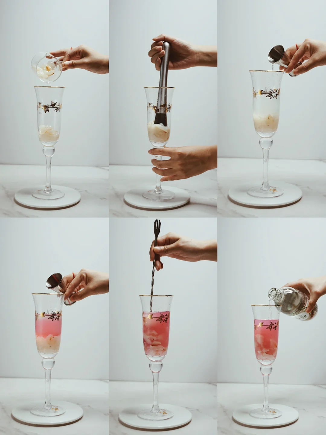 ©️依次倒入50ml玫瑰力娇酒、40ml金酒、20ml柠檬汁、冰块