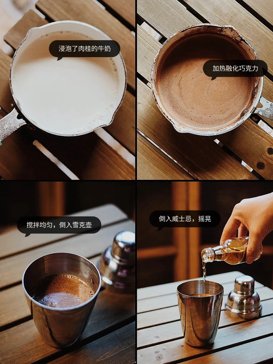 ▪️巧克力放入牛奶中,小火搅拌至融化以后倒入雪克壶里,倒入威士忌,摇晃均匀