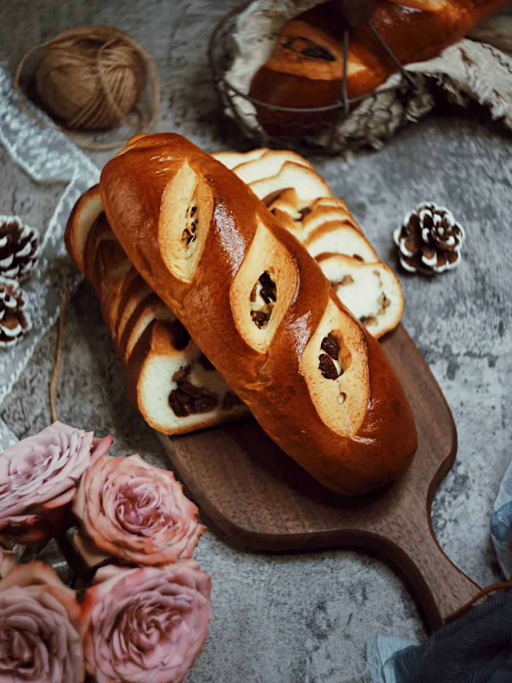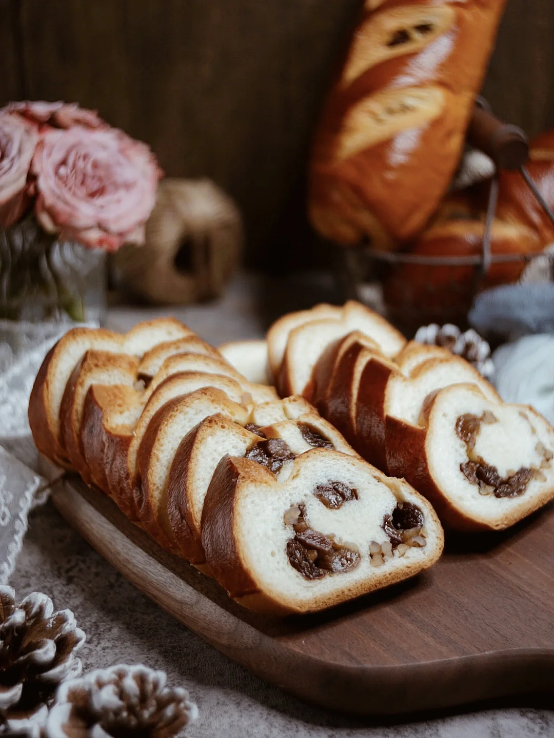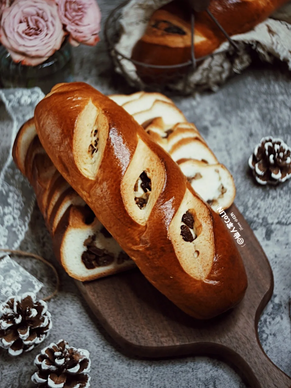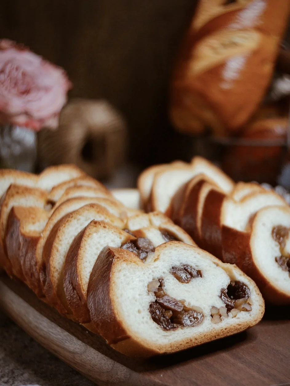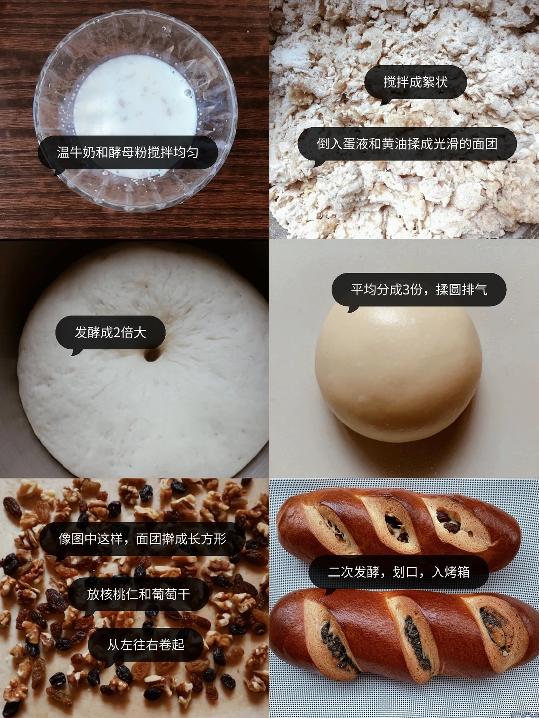 4️⃣取出面团排气滚圆,分成3份,松弛10分钟。擀成长方形。留出4公分左右的位置,撒上葡萄干和核桃仁。