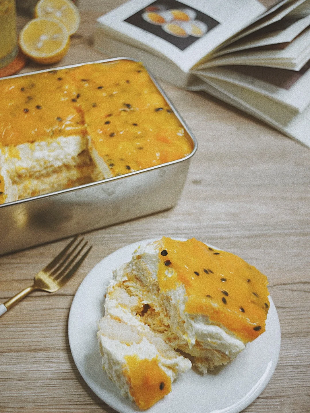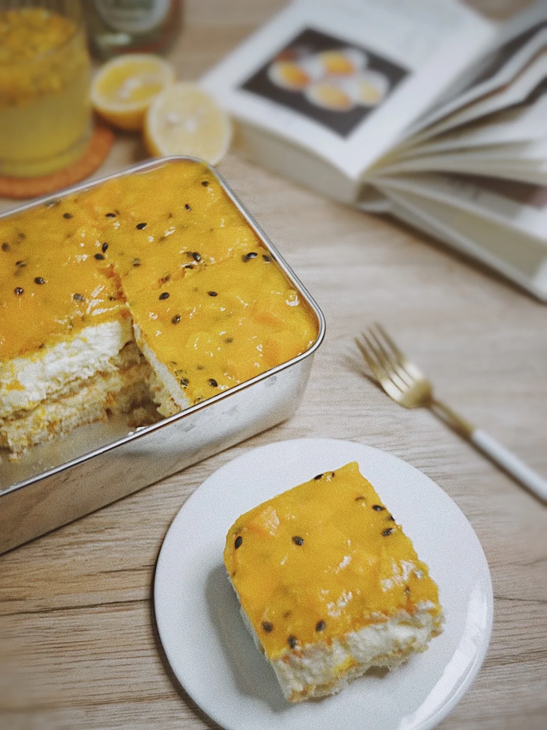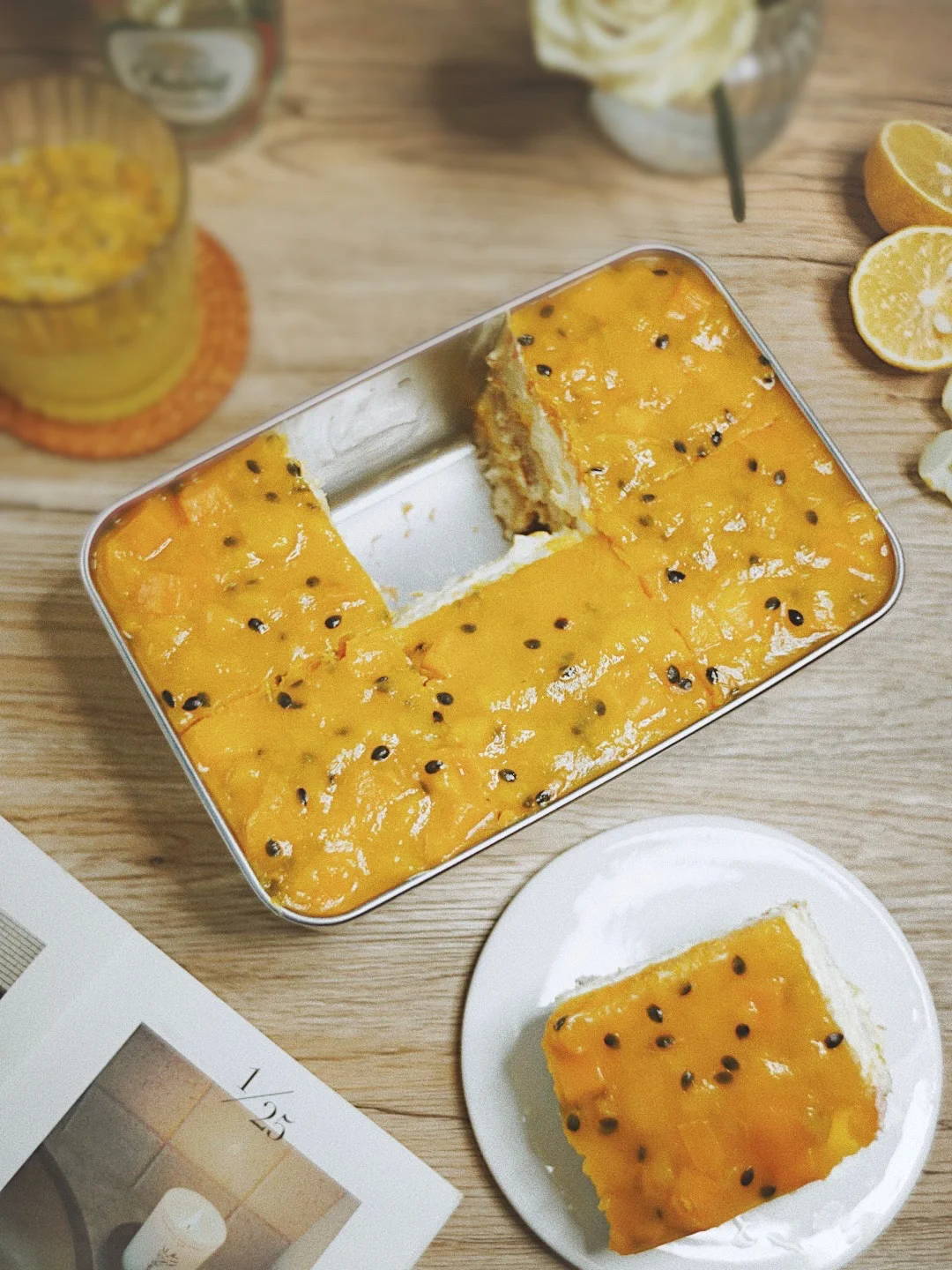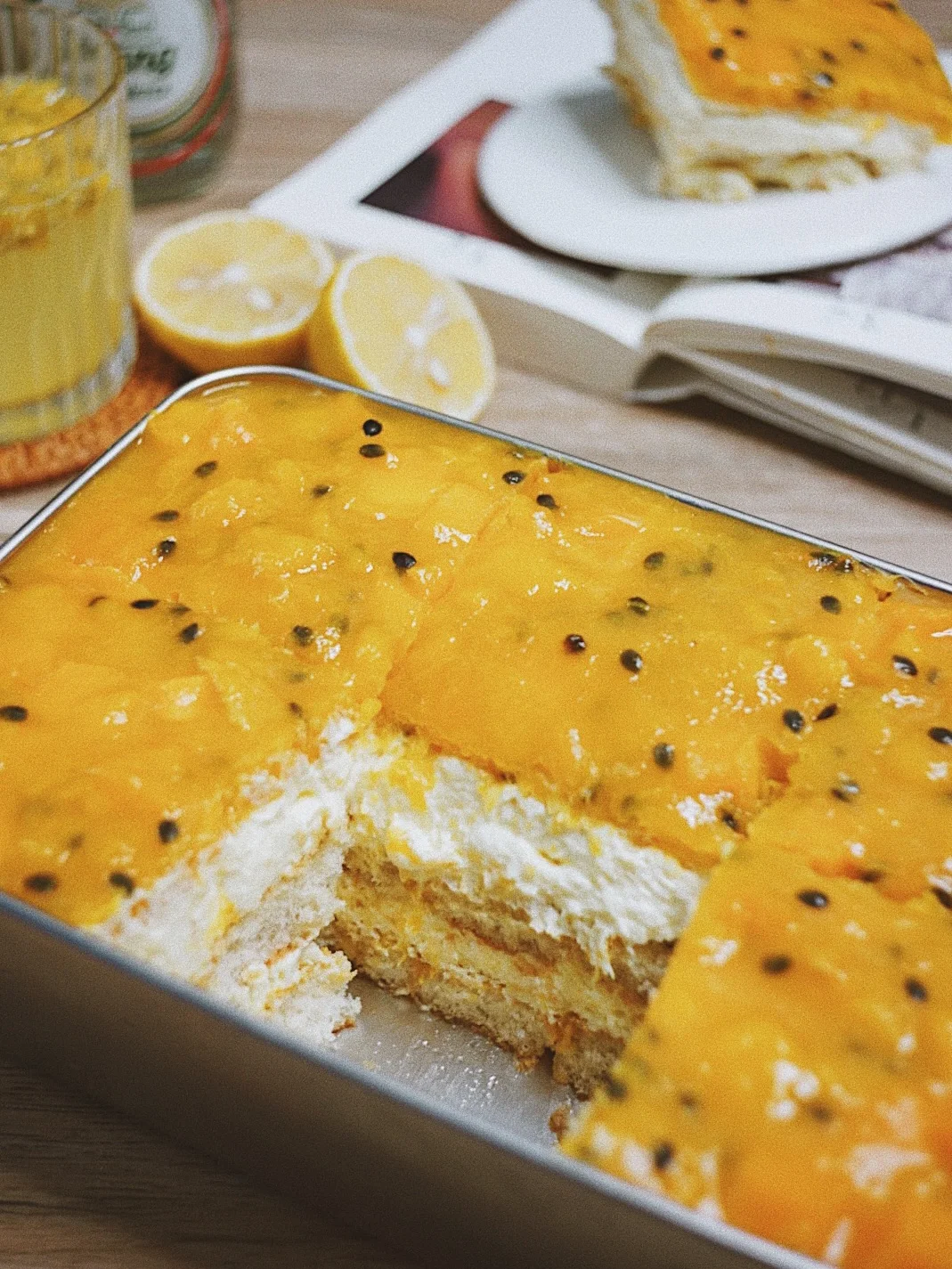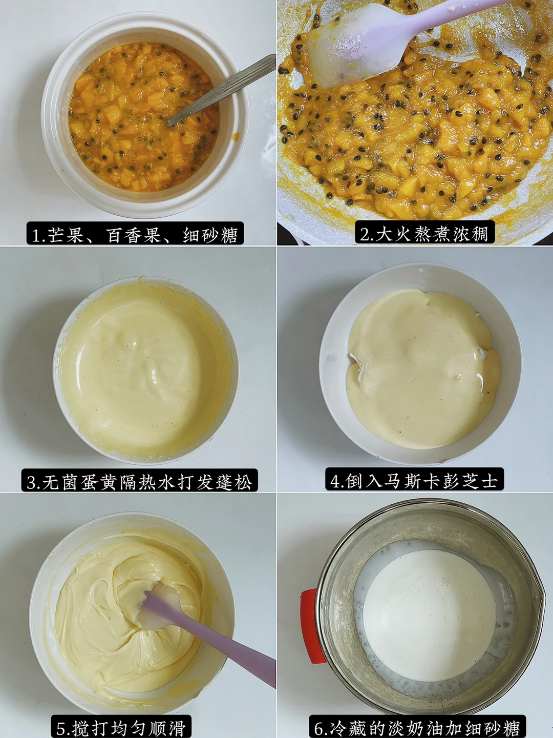 果酱淋面:芒果400g 百香果70g 细砂糖40g 柠檬汁15g
