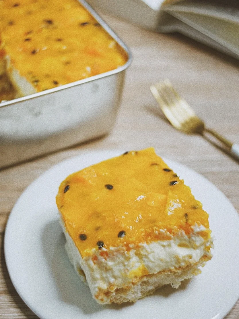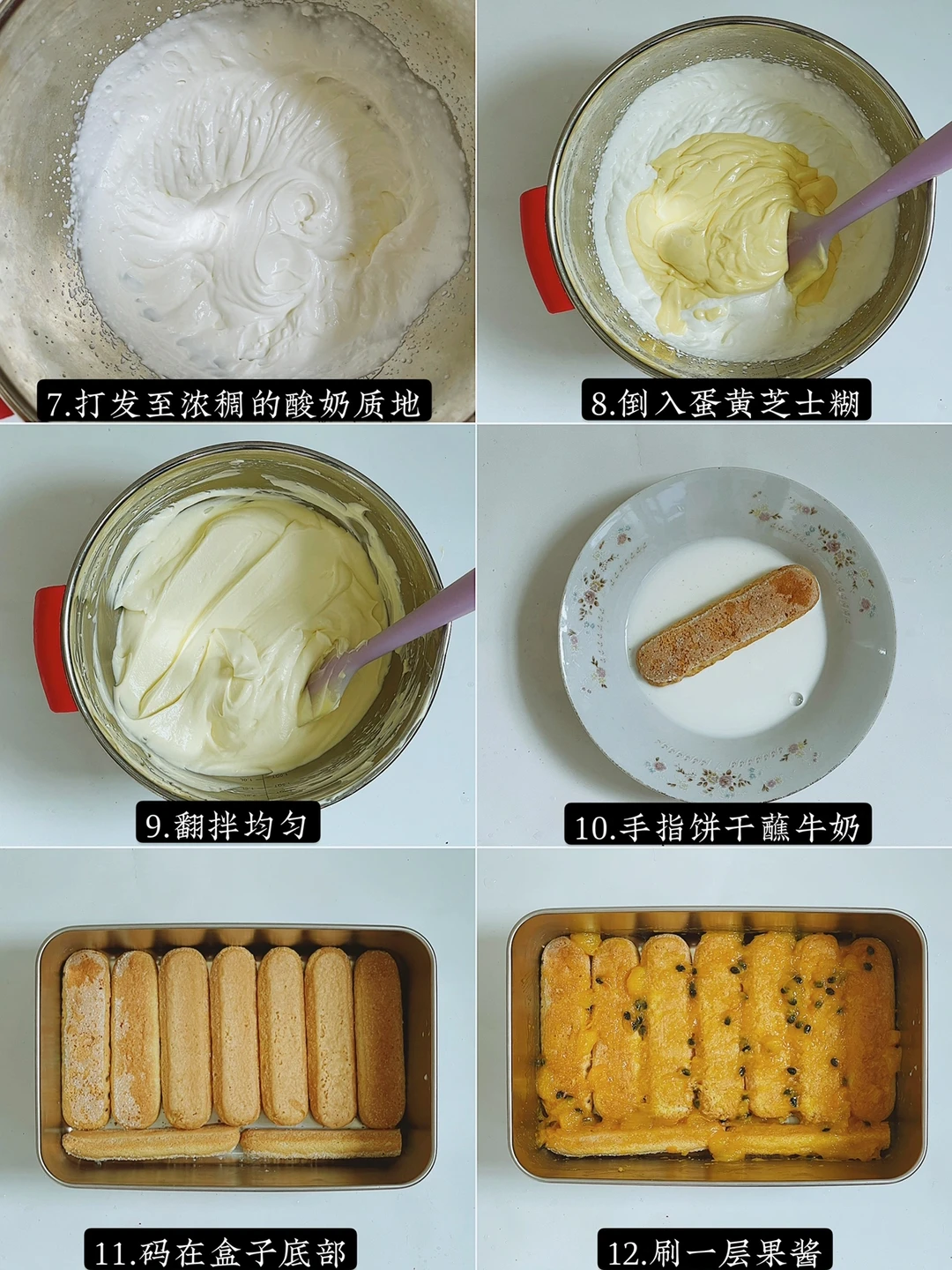 5️⃣手指饼干双面蘸牛奶,铺在容器底部,刷一层芒果百香果酱,倒入一层提拉米苏糊,再铺一层手指饼干,刷果酱,倒入另一半提拉米苏糊。