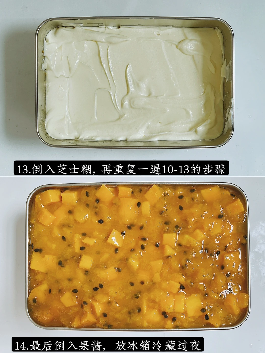 6️⃣均匀淋上芒果百香果果酱,放冰箱冷藏过夜
