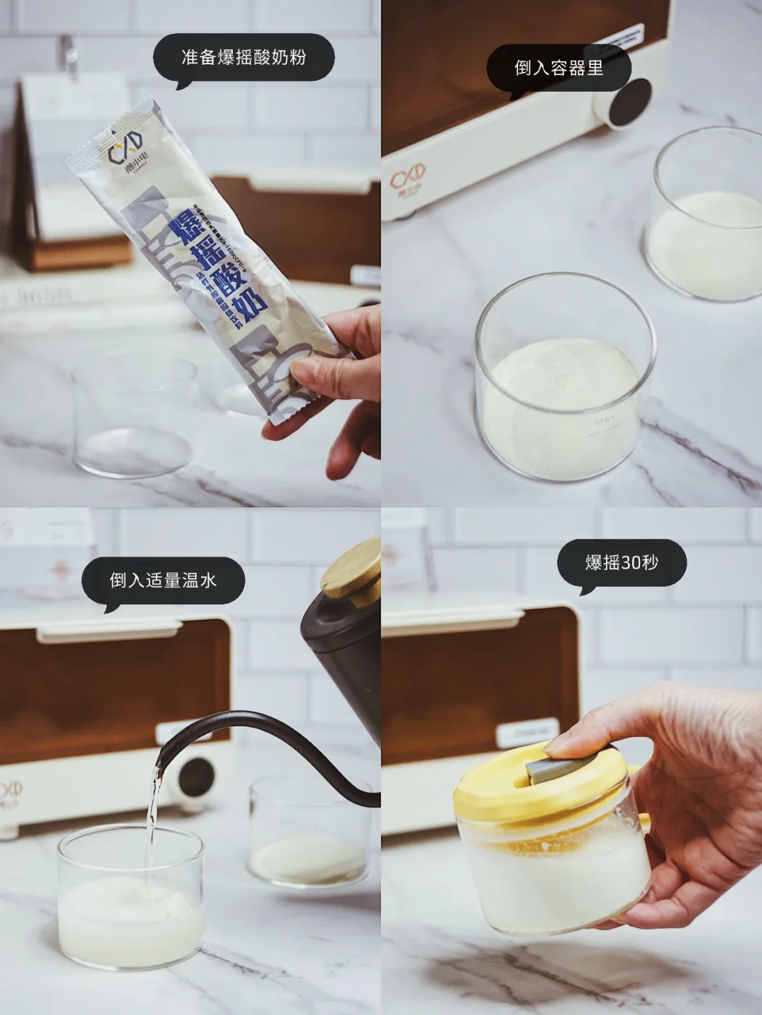 1️⃣爆摇酸奶粉倒入酸奶杯中,加入40度以下的温水至MAX水位线