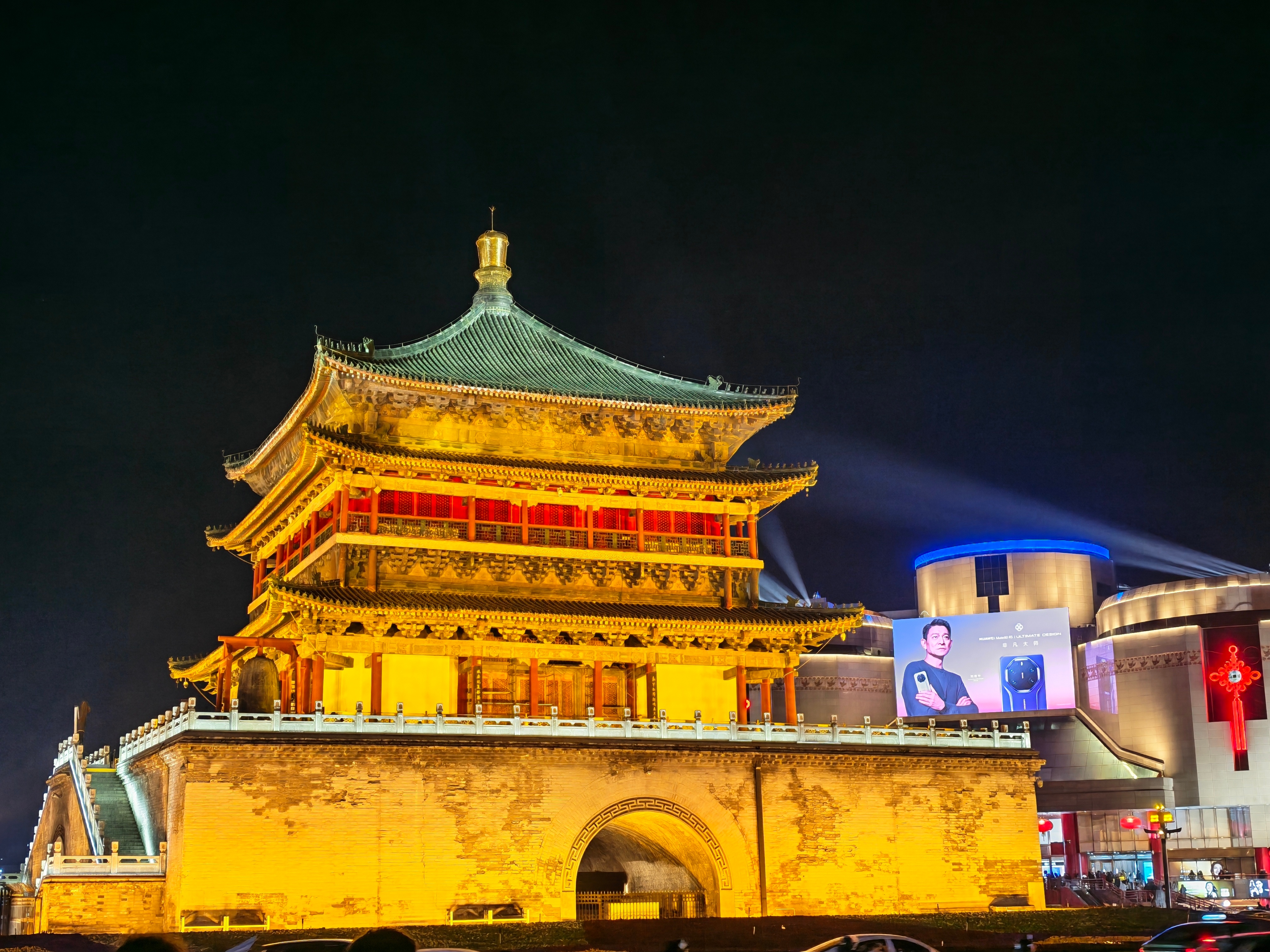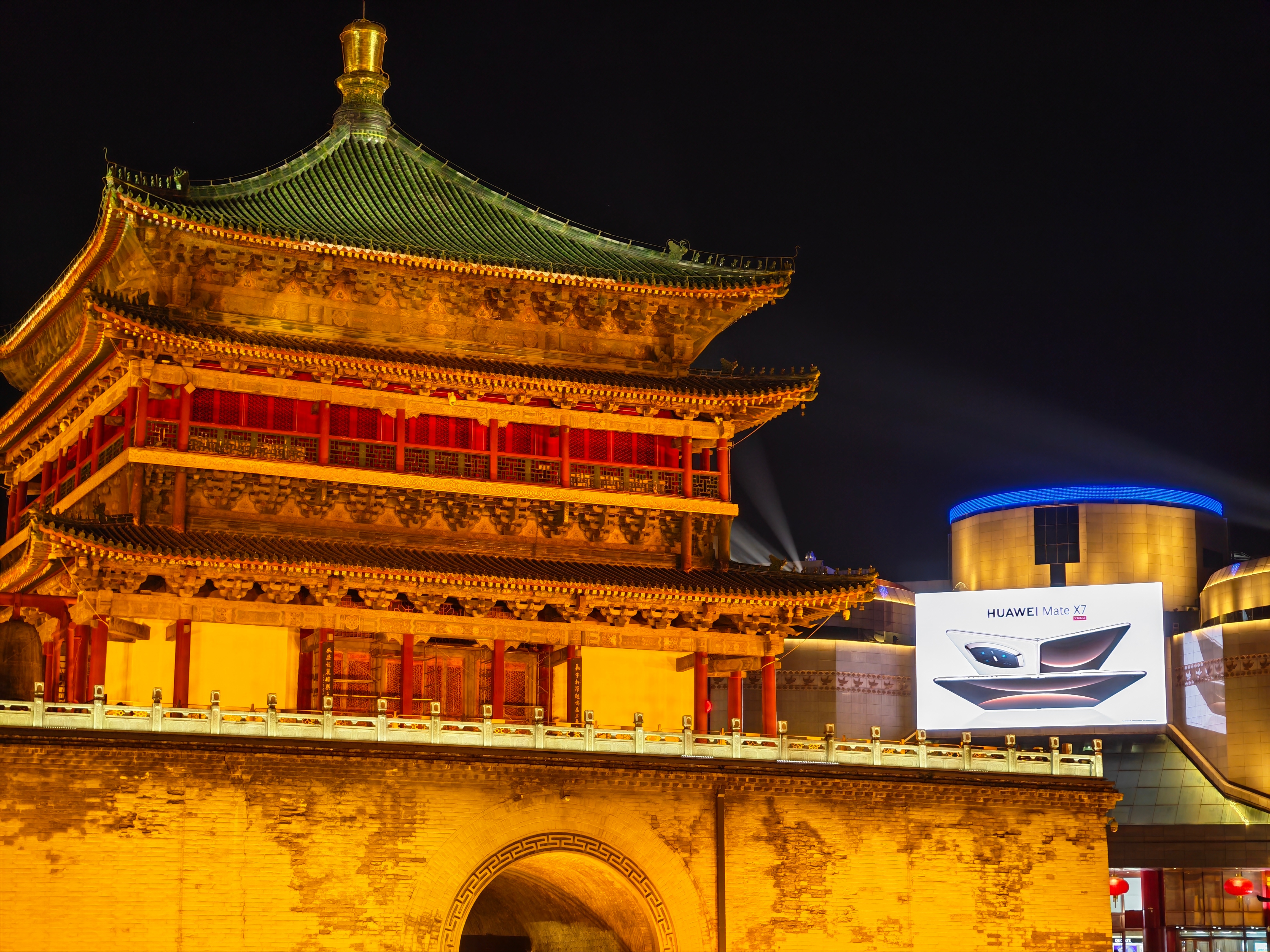 华为 Mate80 RS非凡大师和华为 Mate X7这广告位选的好,很容易拍到和钟楼的同框,人流量这么大,大家路过就能看到还有华仔,大家到西安了可以来拍照打卡。 西安·西安钟楼