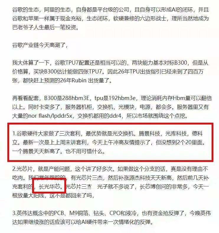周末A股策略:机构排名落幕,12月市场主线逐步清晰一、市场核心逻辑与行情脉络本周A股行情呈现鲜明的存量博弈特征,走势上先冲高回落再探底回升,全程维持缩量格局,核心驱动力源于存量资金的调仓腾挪,量化资金主导市场节奏,通过板块跷跷板效应反复赚取波动差价,成为本周行情的主要推手。从指数表现来看,月底微盘指数表现强势,多只妖股冲击历史新高,成为市场为数不多的亮点。值得注意的是,本周的反弹行情与传统反弹逻辑存在明显差异,常规行情中量能放大往往是反弹启动的信号,而本周量化主导下的反弹则呈现缩量连续上行的特征,结合过往规律来看,当市场后续出现明显放量时,大概率会迎来量化资金的阶段性收割,这一点需要重点警惕。随着11月收官,机构年度排名正式落幕,本周部分机构对AI硬件板块的拉升动作,大概率是排名冲刺阶段的最后发力,毕竟月初已有机构借助锂电池、电解液等板块的炒作提前巩固了排名优势,其余机构顺势跟进冲刺也符合行业惯例。进入12月后,机构资金有望逐步回流市场,届时市场节奏会更具规律性,操作难度将有所下降,无需再面对前期无序波动的格局。二、重点板块节奏与核心逻辑解析存储方向:坚定看好,聚焦高端化升级主线存储板块的看好逻辑始终未变,展望明年行业发展,核心趋势将是“纵向升级”而非“横向扩产”,全球三大存储厂商将重点发力高端化领域,而非单纯扩张产能,制程工艺的大规模升级以及HBM相关领域的突破将成为核心看点,行业资本开支虽会提升,但主要集中于技术升级与设备迭代,因此高端存储器产业链相关设备企业将充分受益,比如设备领域龙头拓荆等标的值得重点关注。从企业表现来看,存储原厂兆易已实现四连涨,表现强势。展望明年,基于长鑫工艺开发的LPDDR5X产品,性能有望追平三星、海力士同类型产品,产品竞争力将大幅提升,后续成长空间值得期待,相关产业链标的可长期跟踪。算力方向:分化明显,聚焦细分领域机会当前算力板块内部分化显著,不同细分方向表现差异较大。达子算力板块资金承接意愿不足,市场参与热情较低;国产算力板块已连续反弹四天,走势相对稳健,当前市场普遍等待下周机构资金回流确认,若资金落地,反弹趋势有望进一步延续。谷歌算力相关的光交换机领域,腾景、光库、德科立三家核心标的资金承接压力较大,从节奏来看,周二的套利窗口其实具备一定参与价值。当前资金正积极挖掘TPU V8产业链,操作手法与此前挖掘Robin产业链如出一辙,这两款产品均计划在2026年下半年亮相,后续可关注产业链相关标的的轮动机会。光模块领域的炒作已延伸至上游隔离器环节,当前隔离器紧缺的核心原因的上游法拉第旋转片供应不足,Coherent掌控了全球50%的法拉第旋转片产能,进而主导了隔离器的市场供应。昨晚市场对东田微的炒作逻辑并不通顺,暂不具备参与价值。回顾此前英伟达算力行情,当时光模块上游200G EML芯片紧缺,市场转而炒作CW光芯片替代逻辑,对应的光芯片龙头及补涨标的均有亮眼表现,此次谷歌算力产业链挖掘隔离器,炒作路径与此前高度一致,后续需警惕题材炒作后的回调风险。红利方向:聚焦高景气细分,把握周期与红利双重机会红利板块可重点关注电解铝与煤炭两大方向。电解铝领域,铝价阶段性回调后,库存快速去化,核心支撑源于下游需求的持续景气,从供需格局来看,铝价后续易涨难跌,行业景气度与新能源产业扩张速度高度相关,此前重点提及的行业四大龙头标的可继续跟踪。煤炭板块兼具周期弹性与稳健红利属性,当前动力煤、炼焦煤价格处于历史低位,为后续反弹提供了充足空间,同时煤企维持较高的分红意愿,具备稳健的红利回报,虽然暂未锁定具体标的,但板块整体性价比突出,可持续关注板块轮动机会。新能源方向:暂无新增逻辑,后续动态跟踪新能源板块目前暂无新的核心逻辑补充,行业整体仍处于调整阶段,后续需重点跟踪产业链供需变化、政策导向及技术突破等关键变量,待明确信号出现后再梳理相关机会。周末建议大家好好休整,下周市场节奏回归正常,后续将结合资金动向与板块变化,进一步细化操作策略。