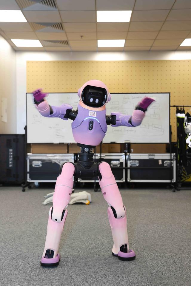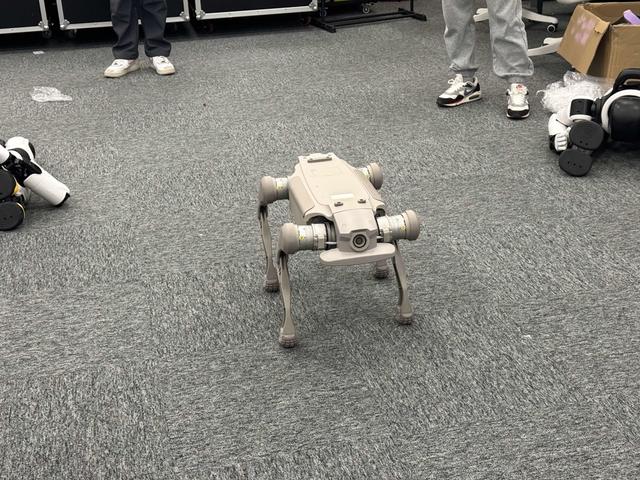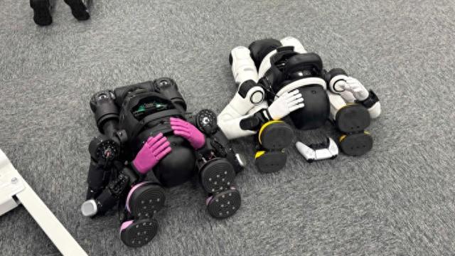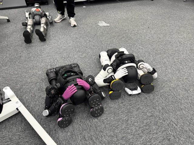 记者采访时,工坊内来自魂伴科技的青年开发者正测试一款四足机器狗的行走与站立衔接。工坊现场摆放了来自智元、宇树、众擎等多家企业的机器人产品并等待测试。一旁则是已经完成测试更新,正伏在地上“休息”的模速空间的专属IP角色“模小速”,紫色的手指关节与粉色的外壳均呼应了模速空间的主色调。