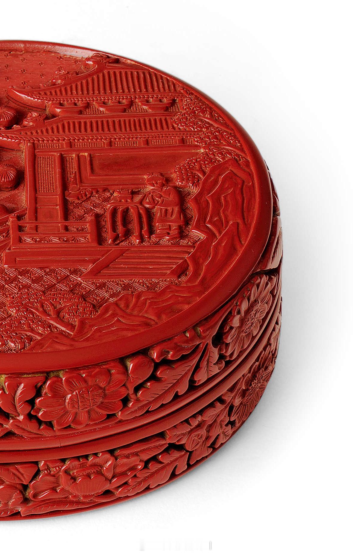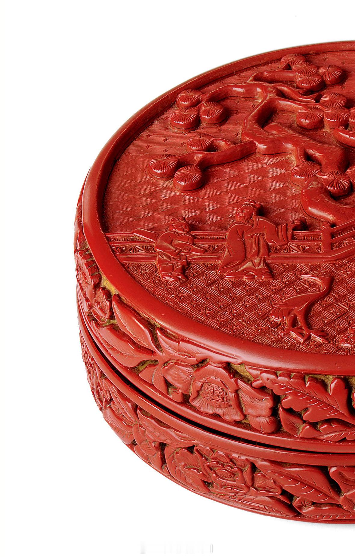 髹饰录 | 明永乐 剔红携琴访友图圆盖盒明朝漆工艺兴盛,尤以明初永乐、宣德两朝为最,高濂燕閒清賞牋说“我朝永乐果园厂(永乐朝皇家漆器作坊设于北京的果园厂,于宣德朝后费立,只有10余年光景,后人习惯将明代宫廷漆器称作厂器)制漆,朱三十六遍为足,时用锡胎木胎,雕以细锦者为多,然底用黑漆,针刻大明永乐年制款文,似过宋元...”永乐的雕漆器,因规定同漆达36层之厚,所以不容易破裂,而且雕刻花纹层次颇多,更见精美。 明早期的宫廷雕漆,继承并发展了元代雕漆的特点,造型端庄规矩,用漆精良润美,雕刻圆熟劲健,磨工精细光洁,但不同的是明代宫廷雕漆缺少个人特点,基本为统一的宫廷风格,品种以各式盘、盒居多,纹饰十分丰富已远胜元代,大体可分为花卉、花鸟、山水人物、龙凤等四大类,其花卉图案,常见牡丹、菊花、茶花、荷花、梅花、芙蓉、石榴、荔枝、葡萄等十余种,它们有时作主纹有时作边饰;其山水人物图案,亦作主纹,立意鲜明,几乎全部是表现文人的林泉之志和淡泊之情,如听琴图、观瀑图、携琴访友、梅妻鹤子等,以工笔手法雕出山林流水、殿阁庭院及人物,具有极强的绘画效果,又有工艺品的艺术韵味。此外,永乐、宣德剔红人物盒较特别之处在于锦地的作法,分别以斜格、波浪和回折纹,代表地面、中景和天空。这些几何形刻线,在光影中闪烁着光芒,丰富了画面的视觉效果,同时地面和水波的斜线还制造出空间深度的错觉,而远景的回折纹则有如天空中点缀着的流云和星光,这三种锦地的作法一直延续到清代,成为剔红漆器山水纹的典型表现方式。 此件明永乐时期的剔红携琴访友图圆盒,为明早期宫廷雕漆中以庭院人物为主题的作 品,直径13.7cm/高5.2cm,属小尺寸者,明初为适应宫廷需要,雕漆器多数加大了尺寸,直径18cm以上者居多,小尺寸者数量较少,台北国立故宫博物院著录的《和光剔彩:故宫藏漆》,2008年,页48/编号028,页49/编号029,可见两件永乐时期同尺寸庭院人物剔红圆盒。另台北国立故宫博物院著录的EMPERORS‘TREASURES-皇家宝藏,页109/编号61,明永乐朝雕漆剔红山林对弈图圆盒,亦为相同尺寸。尽管尺寸不同,但同样出身果园厂,具有相同的漆质和剔刻工艺、表现手法等,同为庭院人物题材的剔红器可参照的博物院藏品颇多,如《故宫博物院藏文物珍品大系-元明漆器》,页50/编号33,页56/编号37,页57/编号38,页59/编号40,页60/编号41; 纽约大都会博物馆著录的 East AsianLacquer-The Florence and Herbert Irving Collection 页84/编号27;日本根津美术馆著录的《根津美术馆藏品-工艺编》平成13年7月30日发行,页164/编号193;又如上海博物馆最近策划的漆器大展“千文文万华” 著录的《千文万华-中国历代漆器艺术》2018年11月,封面作品,页114/编号68,剔红游归图莲瓣形盘,通过对这些精美绝伦的博物院藏品的主体纹饰或边饰的对比、剔刻手法、锦地的运用、展现的宫廷风格等各方面判断与本品应是系出同门,更有甚者 仿佛出自一人之手。本件圆盒作蔗段式,髹朱漆,盒内及底髹黑漆,盖面雕三种锦地,其上右侧雕殿堂,堂内摆一四足长几,上置香炉,一童子拱手伫立在侧恭迎来客,身后设一巨大屏风,殿堂门前山石叠嶂,枝繁叶茂,旁有仙鹤一只,庭院内设整齐栅栏,栏内苍松劲挺,松针如团,院内一老者走来,手指殿堂方向,回首召唤身后携琴童子,是为“携琴访友”之意,盒壁黄漆素地,上雕牡丹、石榴、菊花、茶花四季花卉。尺寸:直径 13.7 cm来源:中国嘉德