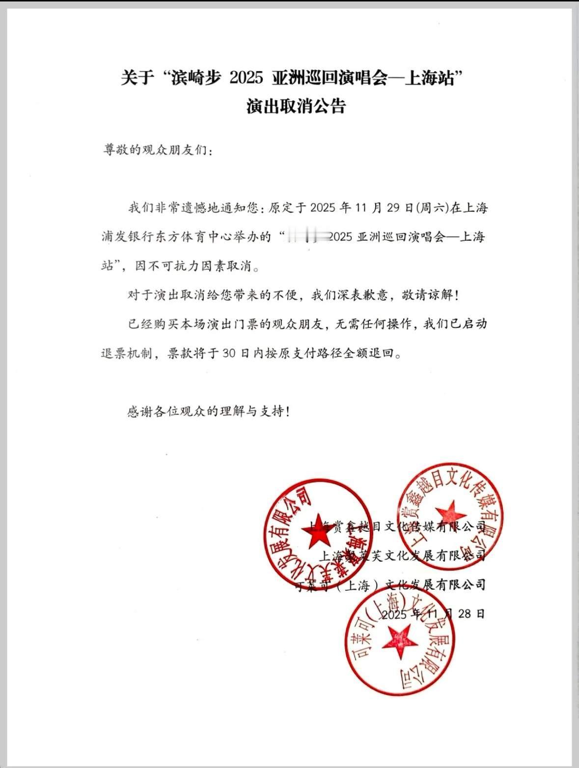 滨崎步上海演唱会突然取消!粉丝炸锅了😱 就在刚刚,主办方克莱可文化发布公告,原定明晚举行的滨崎步上海演唱会因“不可抗力”紧急取消。这可是亚洲巡演的收官之战啊,歌迷们的心碎了一地💔 不过别慌,官方已经承诺30天内全额退票。据说现场已经有不少外地赶来的歌迷在酒店哀嚎,这波操作实在太突然了! 话说今年演唱会的“不可抗力”是不是有点多?建议抢到票的小伙伴赶紧关注退款进度。最后问一句:有明天空出来的朋友吗?要不组个KTV局唱滨崎步金曲?🎤 滨崎步上海演唱会取消