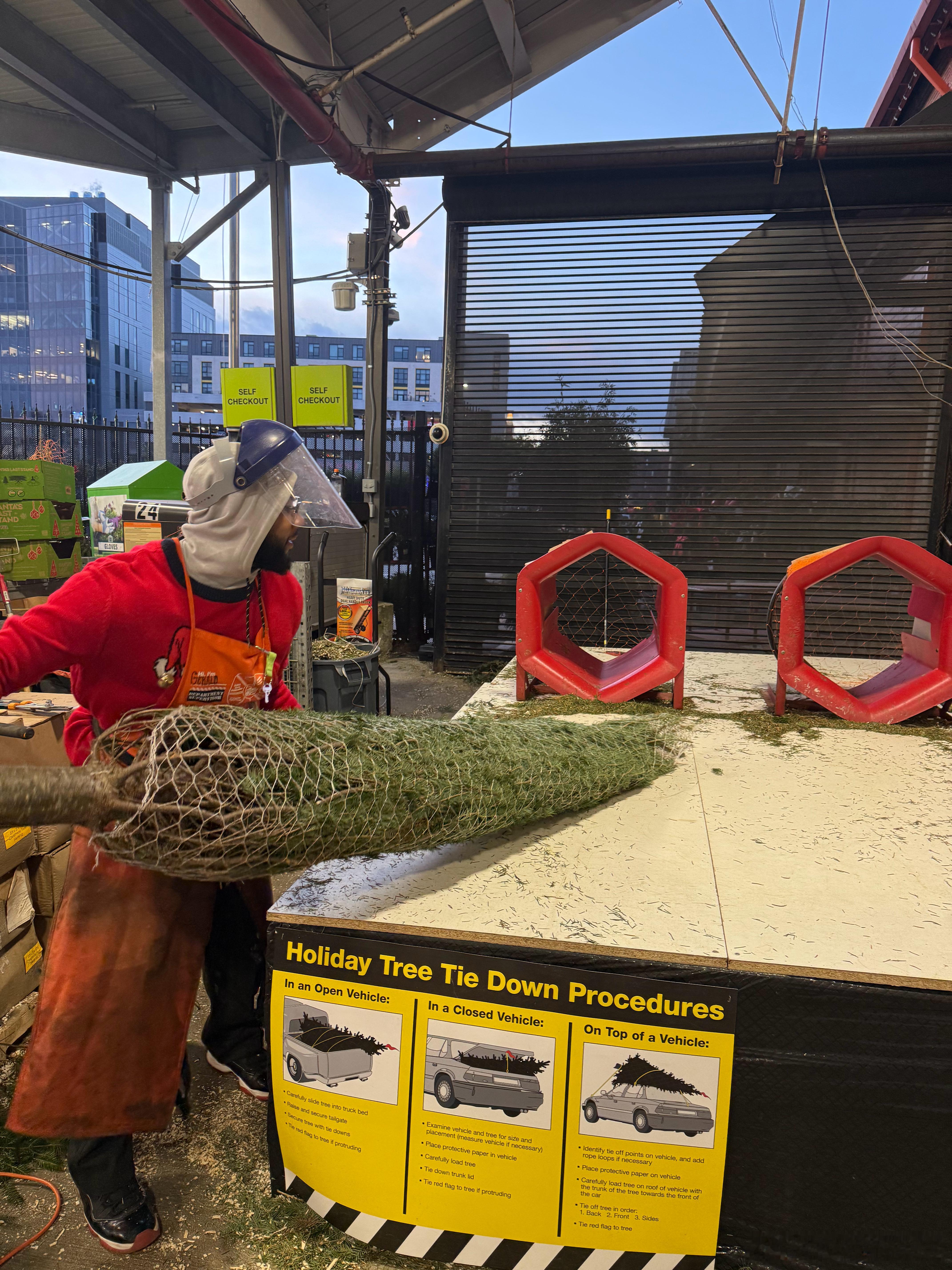 刚刚去买了棵新鲜圣诞树,8尺高,店员又切掉底部一小块,方便吸水。等枝条全部打开,