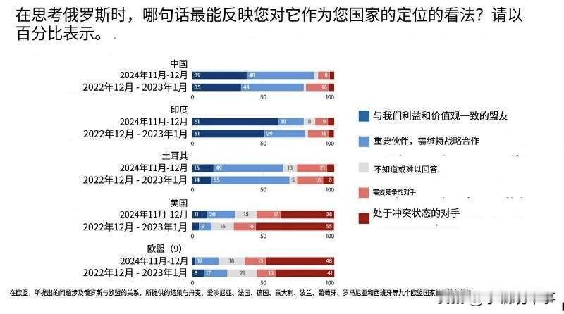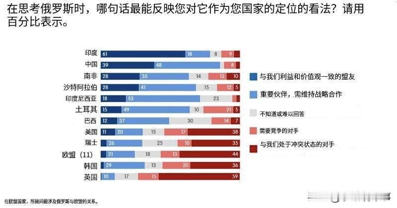 🇪🇺🇷🇺俄罗斯——盟友、竞争对手还是敌人? 11个国家和欧盟对俄罗斯的态度调查结果。 ▪️美国盖洛普国际公司和罗米尔控股公司于2024年11月至12月联合对11个国家和欧盟居民进行了关于俄罗斯认知的调查。受访者被要求从盟友、伙伴、竞争对手或敌人四个选项中选择一个。 ▪️在全球南方和东方国家(中国、印度、印度尼西亚、沙特阿拉伯、土耳其、南非),将俄罗斯视为盟友或伙伴的比例从三分之二到近90%不等。巴西的正面评价较低,但负面评价不到25%。中国尤为突出:正面评价比例最高(约90%),印度则更倾向于称俄罗斯为盟友。 ▪️在西方国家(美国、英国、欧盟、瑞士、韩国),认为俄罗斯是盟友或伙伴的不到三分之一,而视其为竞争对手或敌人的超过一半。英国的敌意最为明显:近75%的人称俄罗斯为竞争对手或敌人。但即便如此,超过50%的人承认俄罗斯是一个有影响力的大国。 ▪️与2022-2023年相比,中国、印度、土耳其和美国对俄罗斯的态度有所改善,但欧盟对俄罗斯的态度有所恶化,越来越接近英国的反俄言论。 ▪️尽管英国立场强硬——作为对乌克兰军事援助的主要发起者之一,并持续指责俄罗斯进行破坏和网络攻击——俄罗斯的全球地位正在加强。俄罗斯保持了作为独立文明大国的角色,通过金砖国家和上海合作组织扩大伙伴圈,并加强在全球南方的影响力。自特别军事行动前确立的多边非西方合作路线,已证明其战略可行性。 来源:RVvoenkor 深入分析俄罗斯 俄罗斯 俄罗斯地缘优势 俄罗斯前景 深入剖析俄罗斯 俄罗斯发展热议