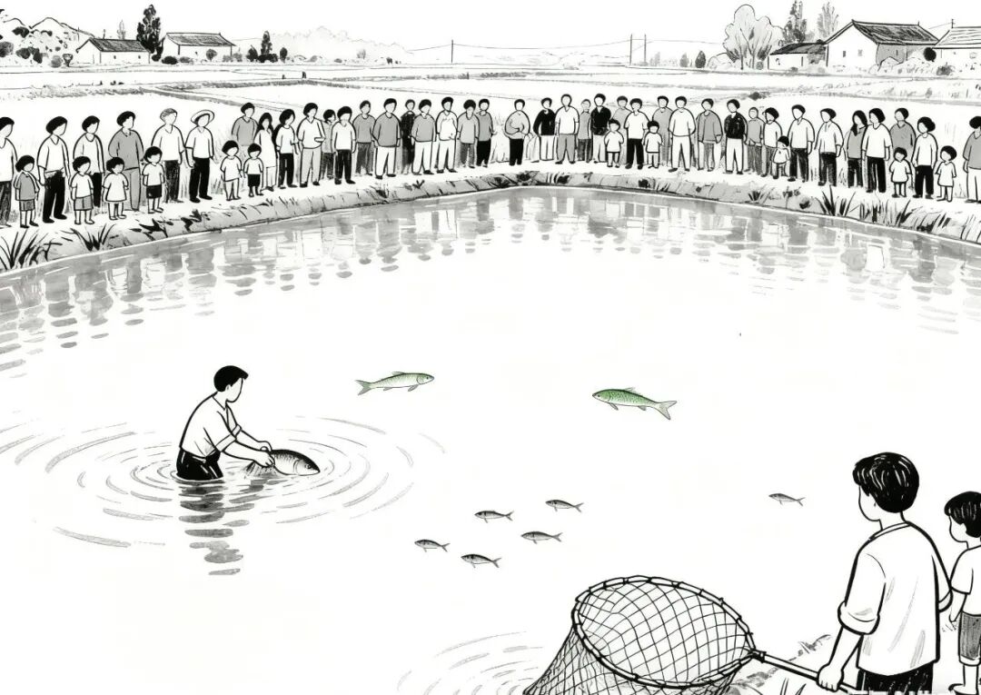 荡鱼可是老街的欢乐节,街上居民纷纷过来看热闹,河沿上站满了人,叽叽喳喳,甚是热闹。刚下网时,沟里不见动静。有些社员着急了:“怎么不见鱼动,是不是发大水时跑掉了?”当荡网来到靠仓库北边的那一段,此处沟最深,坡也陡。两个荡鱼人站在没到半胸的水中,紧紧抵住毛竹竿慢慢前行。一些有经验的社员说:“鱼都躲在深水处,一会儿就露底了。”此时,队长操起竹竿往水里一阵拍打。俗话说,“水打鱼头痛”。顿时,鱼儿纷纷跃出水面,此起彼落,水面像煮开锅的粥。岸上看热闹的人们欢呼起来:“快看,一条大青鱼!”“你瞧,这黄鲢头好大!”荡到沟头时,鱼儿更是跳跃不停,呈现出“日暮紫鳞跃,圆波处处生”的喜人景象。荡鱼人接过岸上传来的木桶,一边慢慢收网,一边用网抄将鱼抄起,装入木桶。这时,队长发话了:“拣大的,小的全放回沟里,养养大再捕。”“对,养养大再捕,年年有余啊!”水里鱼儿欢跳不停,岸上的笑声、掌声连成一片。