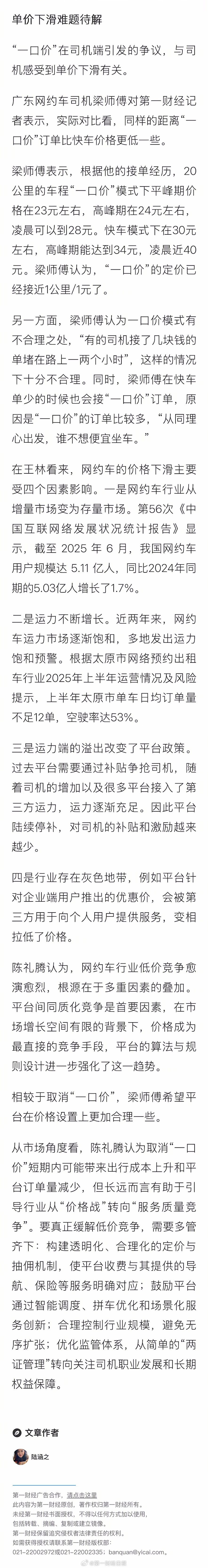 【多城叫停网约车一口价】 网约车低价竞争愈演愈烈 “一口价”与快车的动态计费模式对应,是指平台根据大数据计算,在乘客确定起终点后给出该订单的实际支付金额,这一模式的优势是消费者能够感受到确定性。业内人士王林(化名)对第一财经记者表示,“一口价”模式确实受到消费者的青睐。但在司机端,“一口价”模式获得了截然不同的反馈。王林表示,“一口价”订单会以固定价格成交,在实际运营过程中时长、里程、堵车等情况会变化,可能与预估不同。另外,“一口价”的运价也相对低一点。尤其在非一线城市,低客单价导致司机收入相对较低,因此司机的抵触情绪更强。今年以来,各地监管机构陆续发布通知,推进对“一口价”订单的规范管理。11月19日,重庆市交通运输委联合多部门召开全市网约车平台依法合规经营工作部署会。会议要求,各平台公司新增“一口价”“特惠单”等低价促销活动,应向交通运输、市场监管部门报备,严格禁止各类价格欺骗和恶意压价行为。对现存已开展实施的“一口价”“特惠单”等低价促销活动立即开展清理,不得以低于成本的价格运营扰乱正常市场秩序。